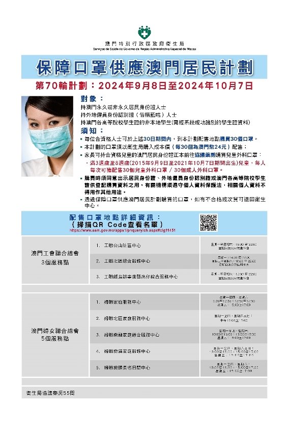 Os Serviços de Saúde informam hoje (dia 5) que, será lançado o 70.º Programa de fornecimento de máscaras aos residentes de Macau a partir de 8 de Setembro de 2024, conforme a seguir discriminado: