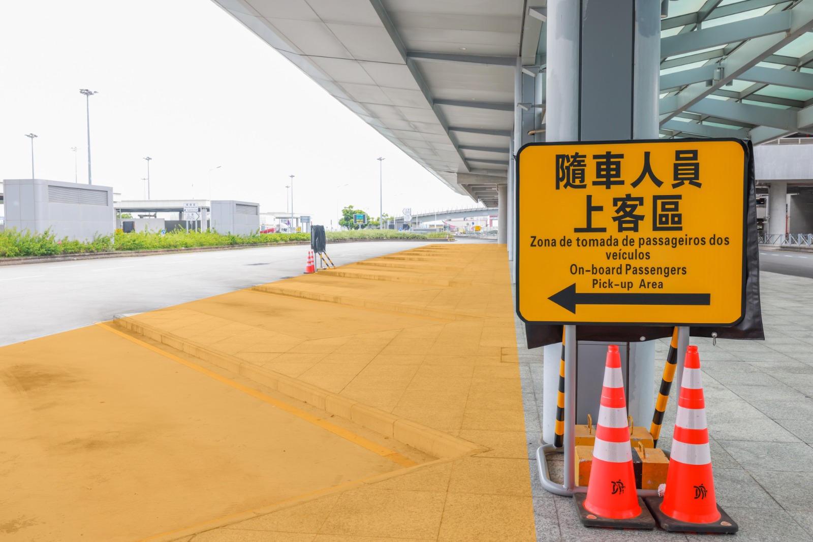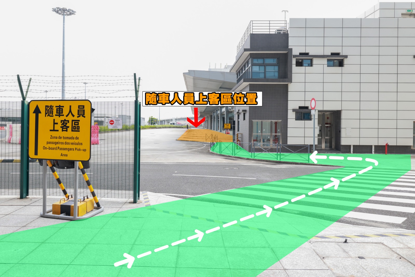 Solicita-se aos condutores e passageiros que prestem atenção à sinalização no local e sigam as instruções dos trabalhadores. Os passageiros que precisem de usar a sala de inspecção de passageiros dos veículos depois de saírem do veículo e digirirem-se ordenadamente pela passagem pedonal à sala de inspecção de passageiros dos veículos para procederem ao tratamento das formalidades de saída fronteiriça, devem dirigir-se à zona de tomada de passageiros dos veículos e aguardar para entrar no veículo. (Imagem 1)