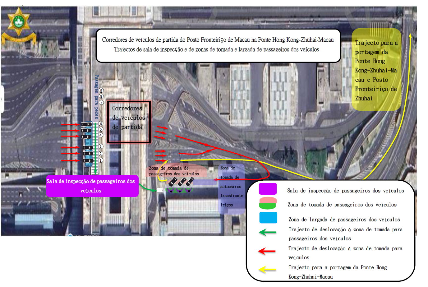 Nota: Os passageiros que podem efectuar a passagem fronteiriça no carro através dos corredores para veículos no Posto de Migração da Ponte de Hong Kong-Zhuhai-Macau incluem: pessoal diplomático, residentes da RAEM, titulares de passaporte da RPC, titulares de Salvo-conduto para a Deslocação a Hong Kong e Macau, titulares de Bilhete de Residente Permanente de Hong Kong, titulares de TI/TNR e indivíduos que não tenham completado 18 anos de idade (apenas na situação de não estarem acompanhados por passageiros maiores).