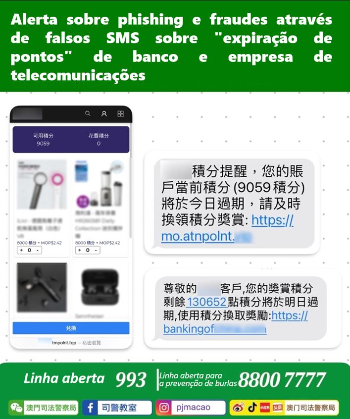 Nos últimos dias, a PJ recebeu denúncias de cidadãos que alegam ter recebido SMS falsos dos bancos e empresas de telecomunicações de Macau, informando-os que “os pontos do cliente estão prestes a expirar” e induzem as pessoas a clicar num link indicado nesta mensagem. Ao fazê-lo, entra-se para um website falso daquele banco ou empresa de telecomunicações, onde é solicitado aos cidadãos que insiram os dados do cartão de crédito para trocar os pontos por presentes a um custo baixo. Assim, os burlões roubam informações dos cartões de crédito para realizar transacções de elevado valor não autorizadas.