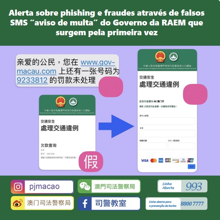 A PJ descobriu que, ultimamente, estão a ser enviados, aleatoriamente, SMS que parecem ser do Governo da RAEM, estes SMS contêm um aviso de multa e induzem as pessoas a clicar num link indicado nesta mensagem para o pagamento. Ao fazê-lo, entra-se para um website falso do Portal do Governo da RAEM, onde é solicitado que seja inserido o número de matrícula do veículo e depois alega que é necessário pagar uma multa por infracção de trânsito, com cartão de crédito. Assim, os dados do cartão de crédito são roubados e permitem aos burlões de realizar transacções de elevado valor não autorizadas.