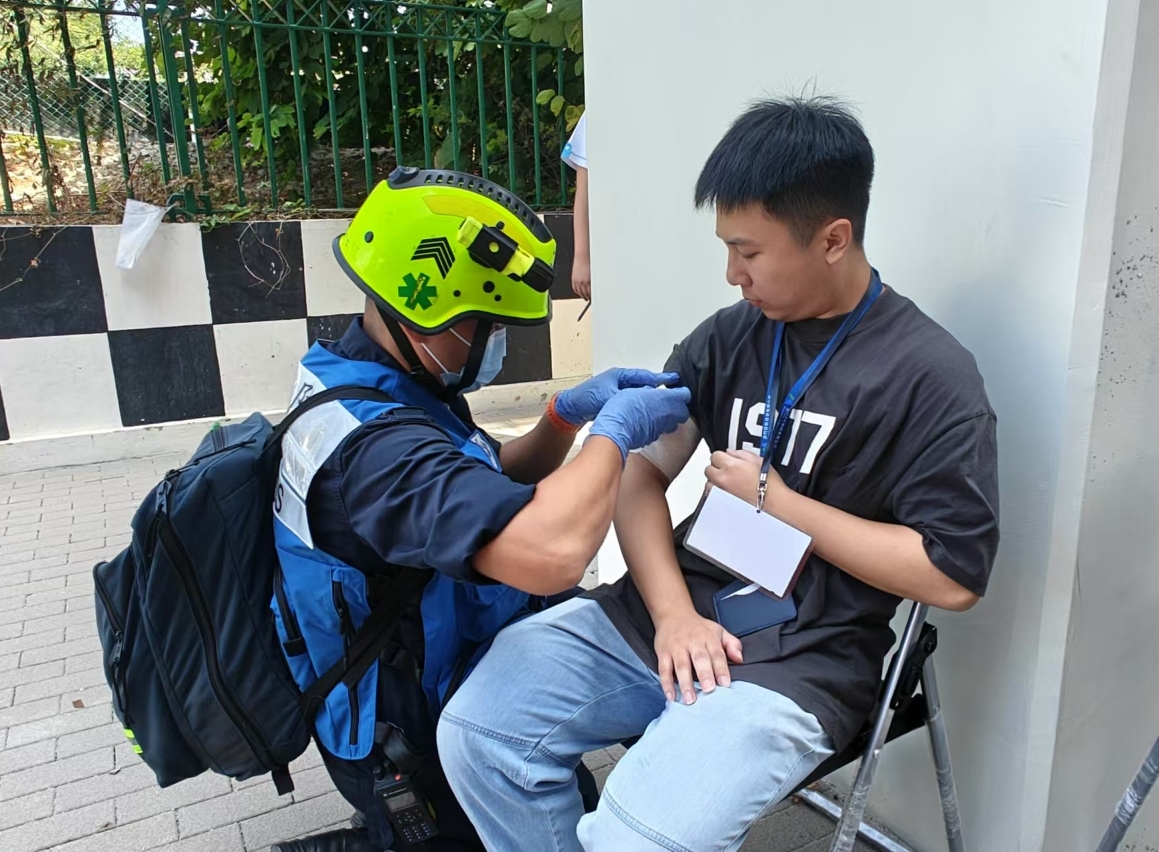 Simulou-se que aconteceu um incêndio provocado pelo carregamento do carregador portátil durante muito tempo numa sala de descanso para funcionários, situada na zona logística da Estação Seac Pai Van do metro ligeiro, pois, a caixa de cartão que ficava ao lado foi acesa e o sistema de alarme de incêndio foi activado. Ao observar a situação, os trabalhadores do metro ligeiro adoptaram as medidas de segurança, organizando a evacuação de emergência conforme o plano de emergência interno e ligando ao CB para pedir ajuda, durante o período, tentaram utilizar o extintor para combater o fogo, mas não obtiveram sucesso.