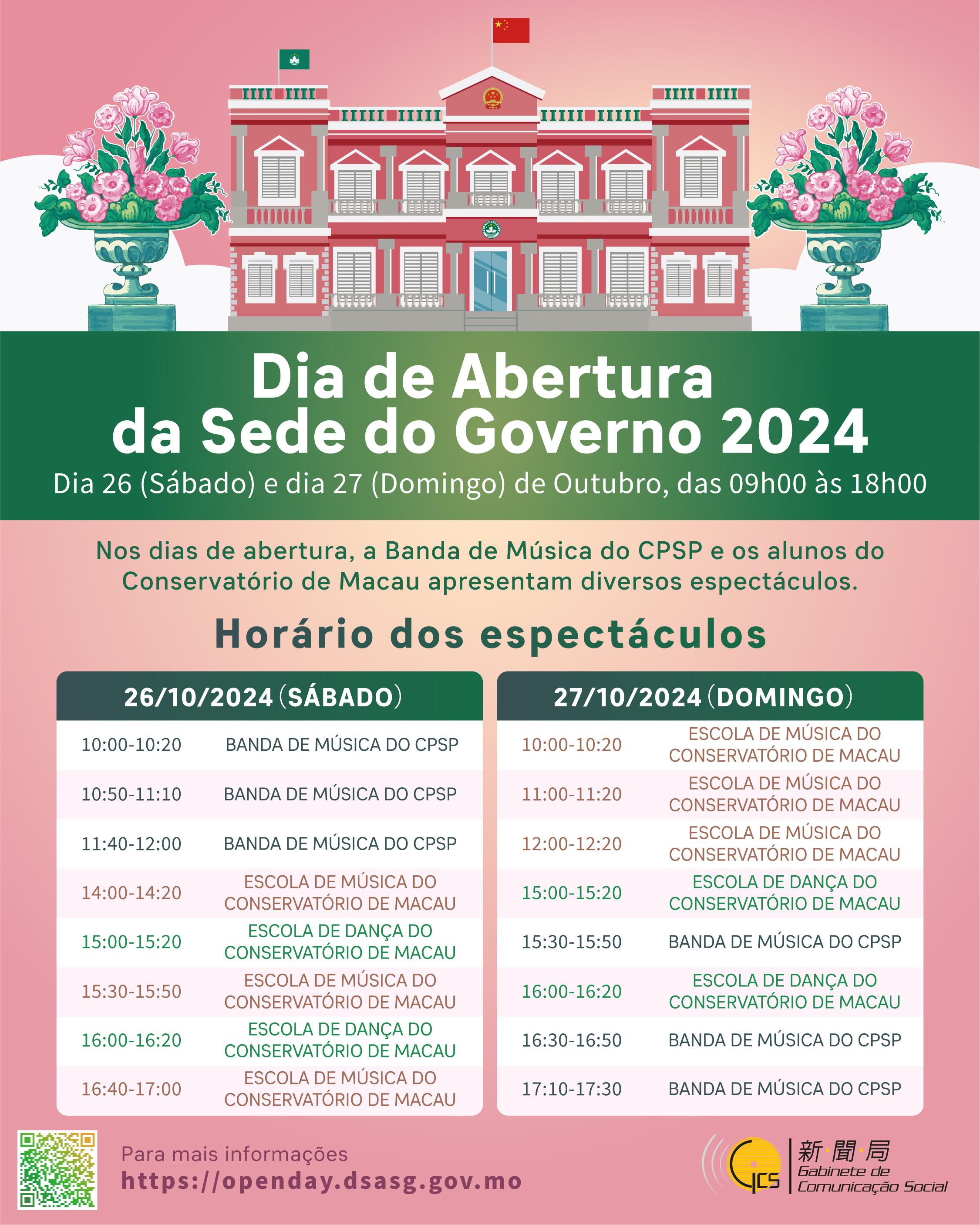 A abertura ao público da Sede do Governo decorre, das 09h00 às 18h00, nos dias 26 (Sábado) e 27 (Domingo) deste mês. Os residentes e turistas podem visitar o Palácio Protocolar e o jardim da Sede do Governo da Região Administrativa Especial de Macau (RAEM). Para comemorar o ano da «dupla celebração», o tema da exposição de flores deste ano será «Celebração do 75.º Aniversário da Implantação da República Popular da China e do 25.º Aniversário do Retorno de Macau à Pátria», e o público pode ainda assistir a espectáculos, nomeadamente, da Banda de Música do CPSP e dança, e assim sentir o ambiente festivo.