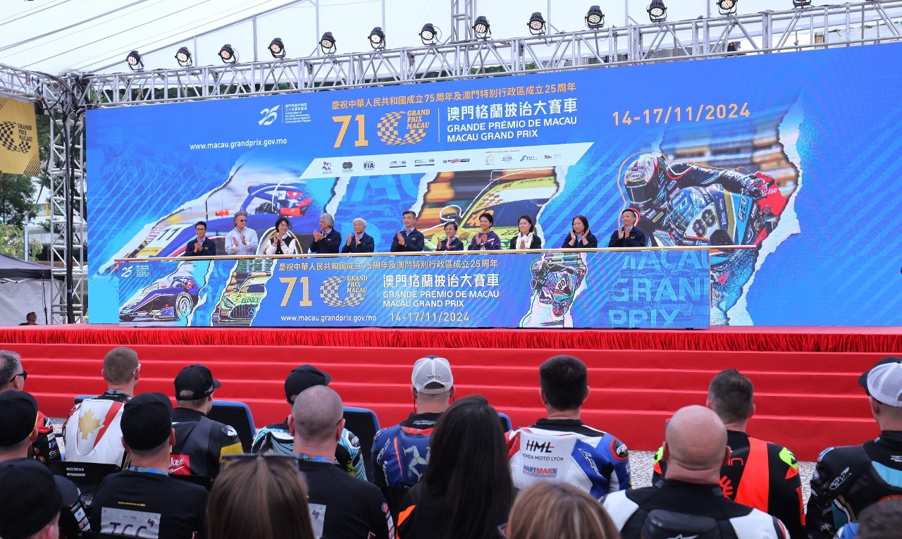 A cerimónia de abertura teve lugar hoje (9) pelas 15h00 na Praça do Tap Seac e estiveram presentes o presidente do Instituto do Desporto e coordenador da Comissão Organizadora do Grande Prémio de Macau (COGPM), Luís Gomes, o membro do Conselho Executivo, deputado da Assembleia Legislativa e membro da COGPM, Chan Chak Mo, a directora dos Serviços de Turismo e membro da COGPM, Maria Helena de Senna Fernandes, o presidente da Assembleia Geral da Associação Geral de Automóvel de Macau – China e coordenador da Subcomissão Desportiva da COGPM, Chong Coc Veng, as principais entidades patrocinadoras: a assistente sénior vice-presidente das Relações Públicas do Galaxy Entertainment Group, Linda Wong, a vice-presidente da Comunicações Corporativas e Assuntos Comunitários da Sands China Ltd., Catherine Kong, a vice-presidente sénior de Desenvolvimento e Mercado de Marca da SJM Resorts, S.A., Porcia Leung e o vice-presidente sénior de Hospiltalidade da MGM, Iwan Dietschi, a vice-presidente substituta do Instituto do Desporto e coordenadora-adjunta da COGPM, Lei Si Leng, o subdirector dos Serviços de Turismo e membro da COGPM, Cheng Wai Tong, o secretário-geral da COGPM, Vong Ka Kun, as entidades patrocinadoras especiais: a directora de Marketing de Wynn Macau, Limited, Zoe Zou e o vice-CEO sénior, director de Marketing Global de Melco Resorts & Entertainment Ltd. e director geral de Altira Macau e Mocha Clubs, Raymond Lo, e outros membros da COGPM e das suas Subcomissões, dos representantes dos patrocinadores, dos membros do Conselho do Desporto e dos pilotos de motos, entre outros.