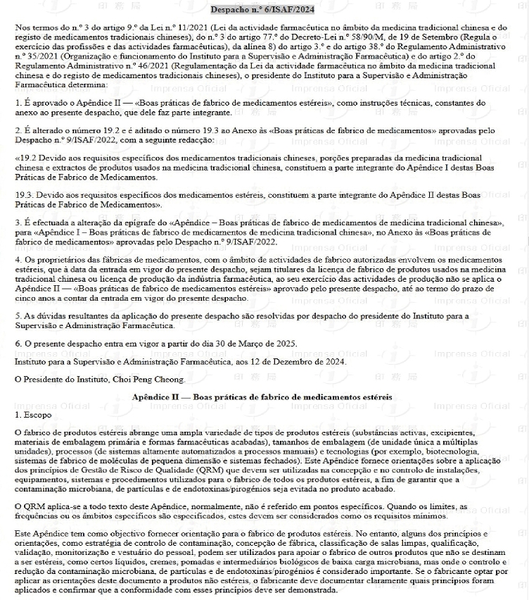 Com o intuito de reforçar a gestão de todo o ciclo de vida de medicamentos e em articulação com o desenvolvimento da diversificação adequada da economia de Macau, o Instituto para a Supervisão e Administração Farmacêutica (ISAF) publicou, em 26 de Dezembro de 2024, duas instruções técnicas, nomeadamente, as “Boas práticas clínicas de medicamentos (GCP)” e as “Boas práticas de fabrico de medicamentos estéreis”. As duas instruções técnico acima referidas entrarão em vigor a partir de 30 de Março de 2025, e as existentes fábricas locais de medicamentos que exercem a actividade de fabrico de medicamentos estéreis têm um período de transição de 5 anos para cumprir os requisitos das novas normas.
