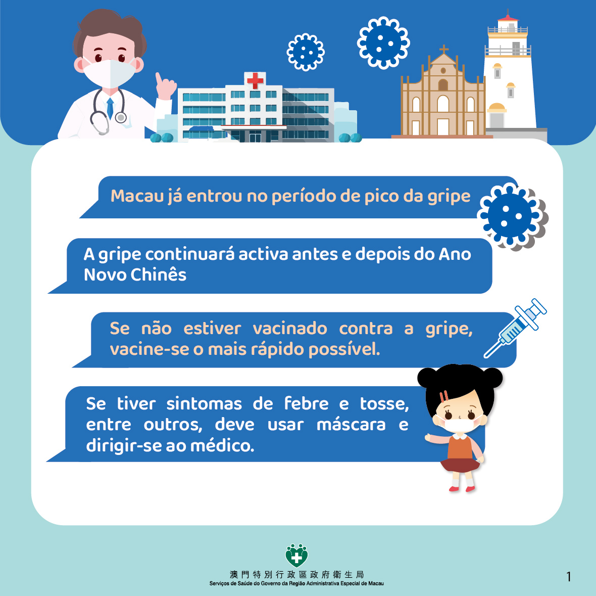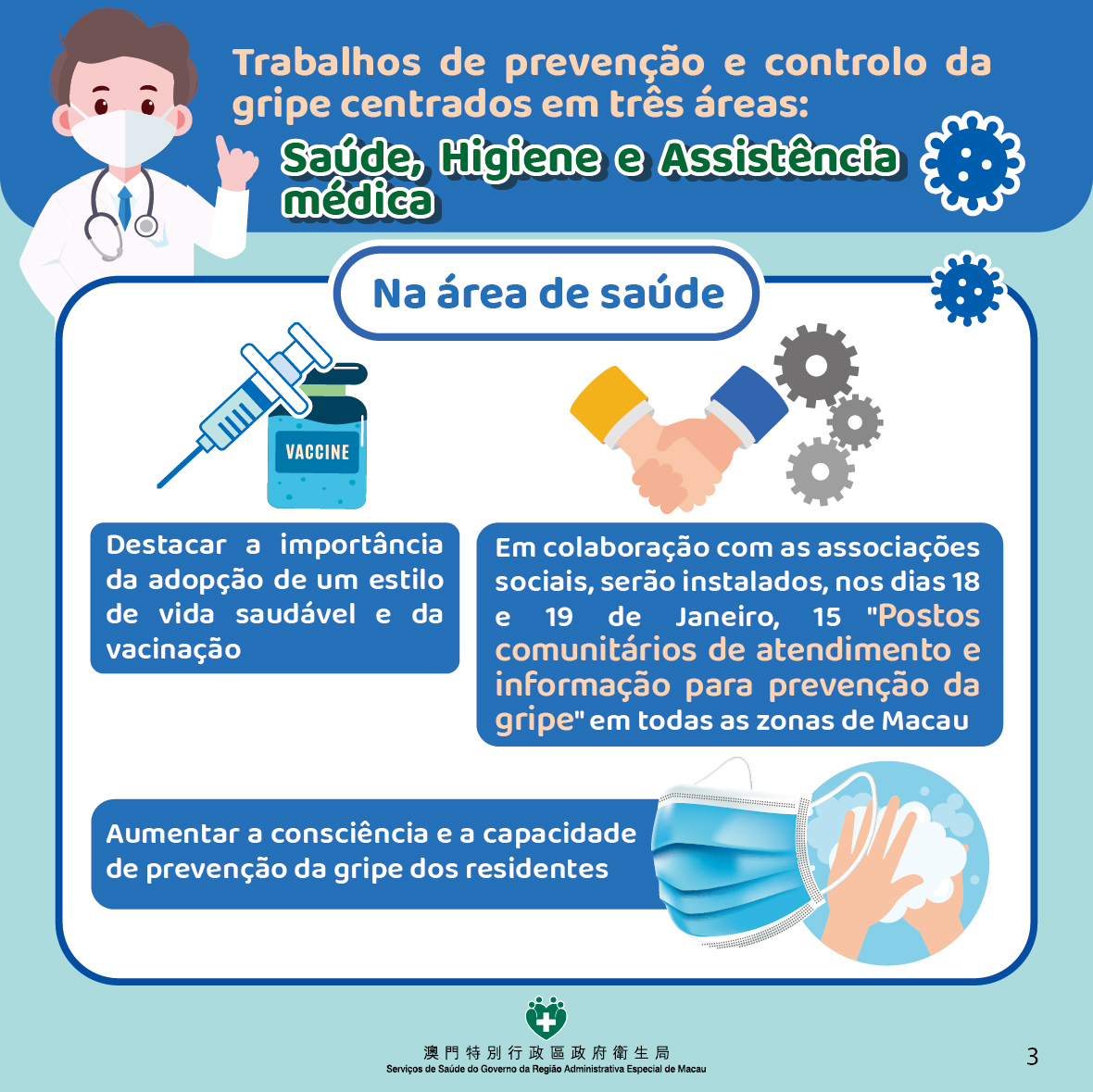 Os Serviços de Saúde, a DSEDJ e o IAS irão iniciar uma série de trabalhos interdepartamentais de prevenção e controlo, nomeadamente no que diz respeito à saúde, higiene e assistência médica. No que diz respeito à saúde, os Serviços de Saúde, em colaboração com as associações sociais e instituições médicas, irão instalar, no próximo fim-de-semana (18 e 19 de Janeiro), 15 postos comunitários de atendimento e informação para a prevenção da gripe junto de todas as zonas de Macau, com vista a reforçar a educação para a saúde e a promover a vacinação. No âmbito da higiene, foram produzidos vários materiais didácticos e infografias, de forma a promover a importância da manutenção da higiene pessoal e ambiental através da internet (página electrónica sobre informações de doenças transmissíveis: https://www.ssm.gov.mo/portal/csr/ch/main.aspx).