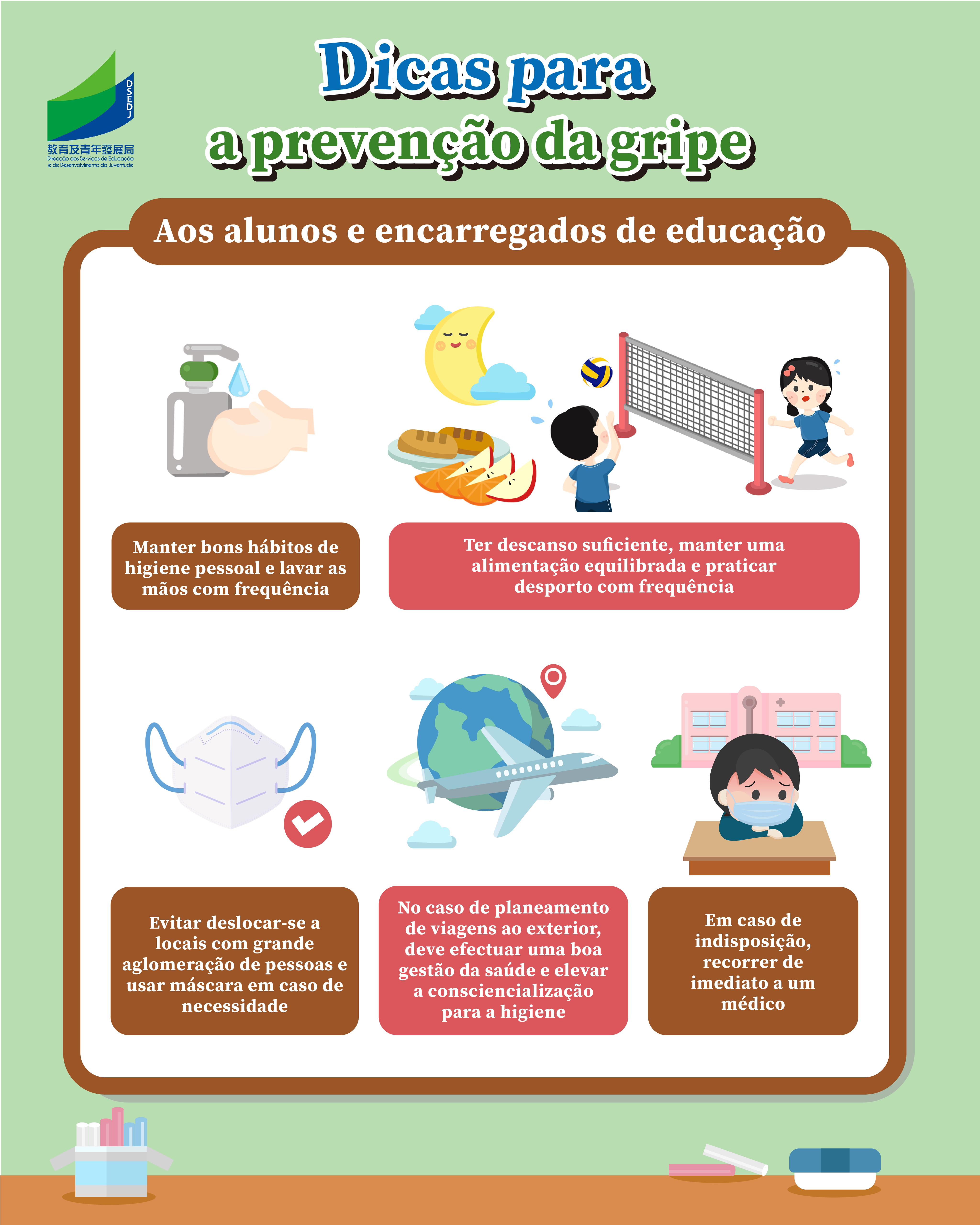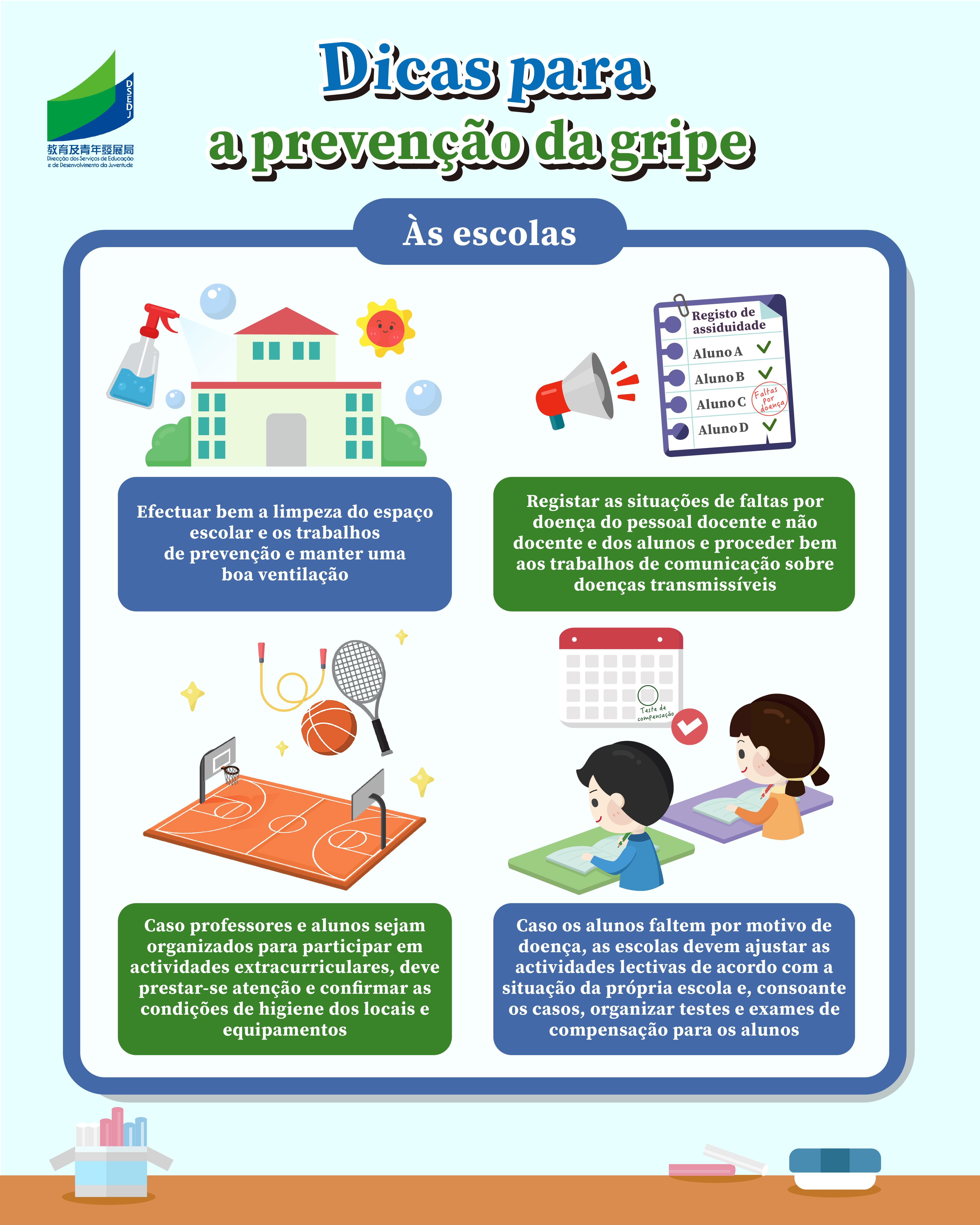 No âmbito de escolas, com a aproximação do período do pico da gripe e dos feriados do Ano Novo Lunar, a DSEDJ irá realizar, na quarta-feira (dia 15), uma reunião com todas as escolas de Macau, alertando-as para procederem bem aos trabalhos de limpeza e prevenção escolar, manterem a higiene ambiental escolar e uma boa ventilação de ar, reforçando a educação para a saúde. Além disso, as escolas devem continuar a conhecer a condição física dos alunos antes e após as férias do Ano Novo Lunar. Os pais devem permanecer atentos ao estado físico dos seus filhos, especialmente durante as viagens programadas para essa época, e devem aumentar a sua consciencialização sobre a higiene. Em caso de indisposição, devem recorrer ao médico, o mais rápido possível, permanecer em repouso e informar atempadamente a escola sobre a situação de saúde dos seus filhos.
