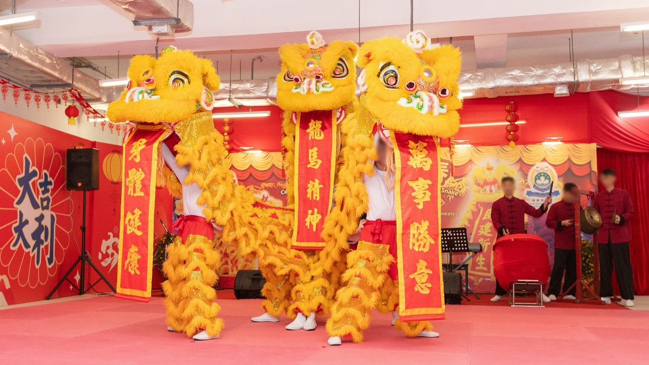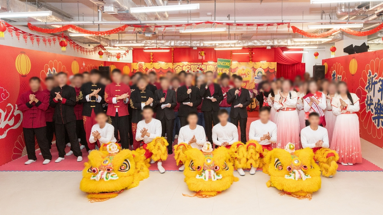 Na manhã do dia 15 de Janeiro, participaram na primeira sessão da festa os representantes convidados de vários órgãos do governo e organizações de serviço social e presidiram à cerimónia de vivificação de leões o Secretário para a Segurança, Wong Sio Chak, o Director da DSC, Cheng Fong Meng, e o Secretário-geral da Cáritas de Macau, Pun Chi Meng. Com o som dos gongos e tambores, deu-se início oficialmente à Festa do Ano Novo Lunar. Na festa, os reclusos fizeram sucessivamente diversas apresentações, incluindo dança do leão, coro multilingue, dança de bandeiras, artes marciais chinesas, dança do guarda-chuva e interpretação de canções originais. As apresentações ricas e vibrantes mostraram plenamente os talentos dos reclusos, recebendo aplausos entusiásticos de todos. Por fim, a festa terminou de forma memorável com um emocionante coro em conjunto.