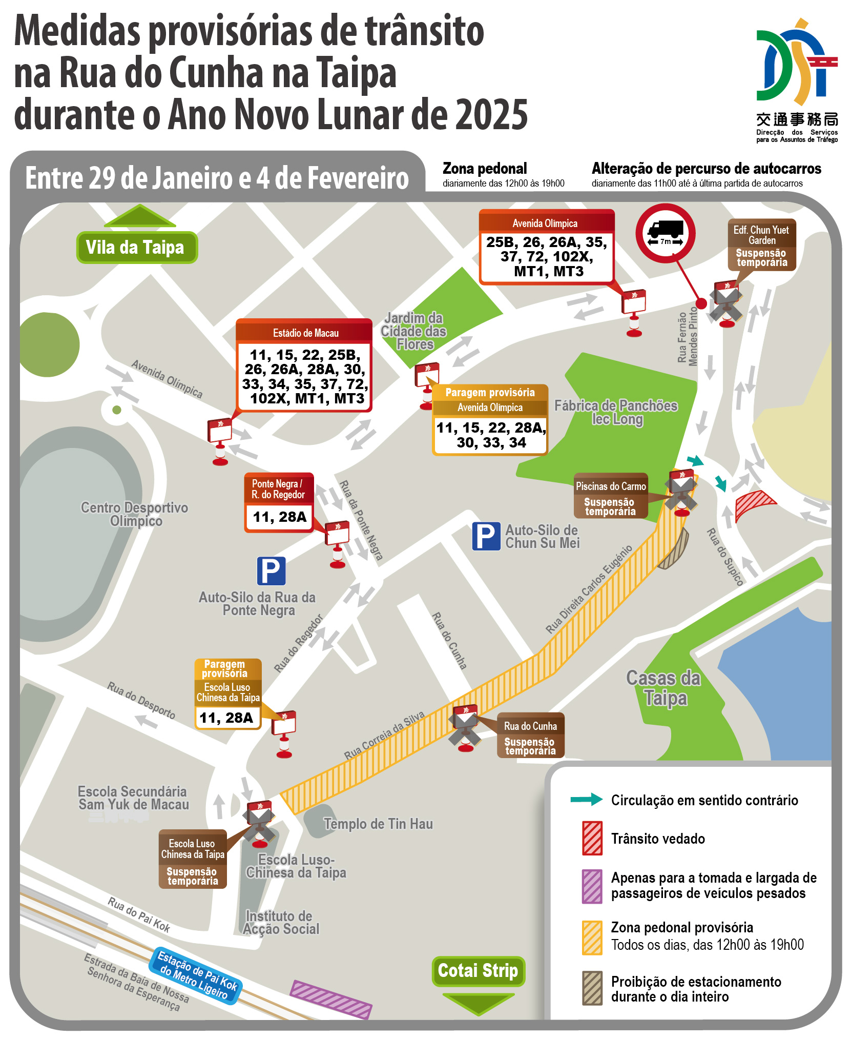 Obs.: Os ajustamentos provisórios relativos ao plano da zona pedonal provisória no bairro antigo da Taipa, à Parada de Celebração do Ano Novo Chinês e ao espectáculo de fogo-de-artifício serão divulgados na página electrónica da DSAT.