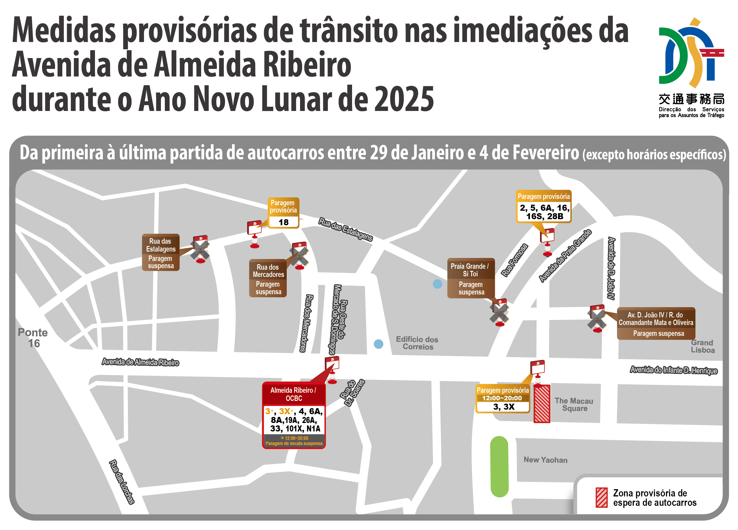Em resposta às necessidades de deslocação dos residentes e turistas durante o Ano Novo Lunar, a Direcção dos Serviços para os Assuntos de Tráfego (DSAT), tendo coordenado com o Corpo de Polícia de Segurança Pública (CPSP), os Serviços de Alfândega (SA), o Instituto para os Assuntos Municipais (IAM), as companhias de autocarros, o transporte transfronteiriço de passageiros, as operadoras de jogo, os hotéis e a empresa de gestão do lado este da Praça das Portas do Cerco, irá implementar medidas provisórias em locais onde se prevê um grande fluxo de pessoas e veículos, por forma a evitar os potenciais riscos daí resultantes.