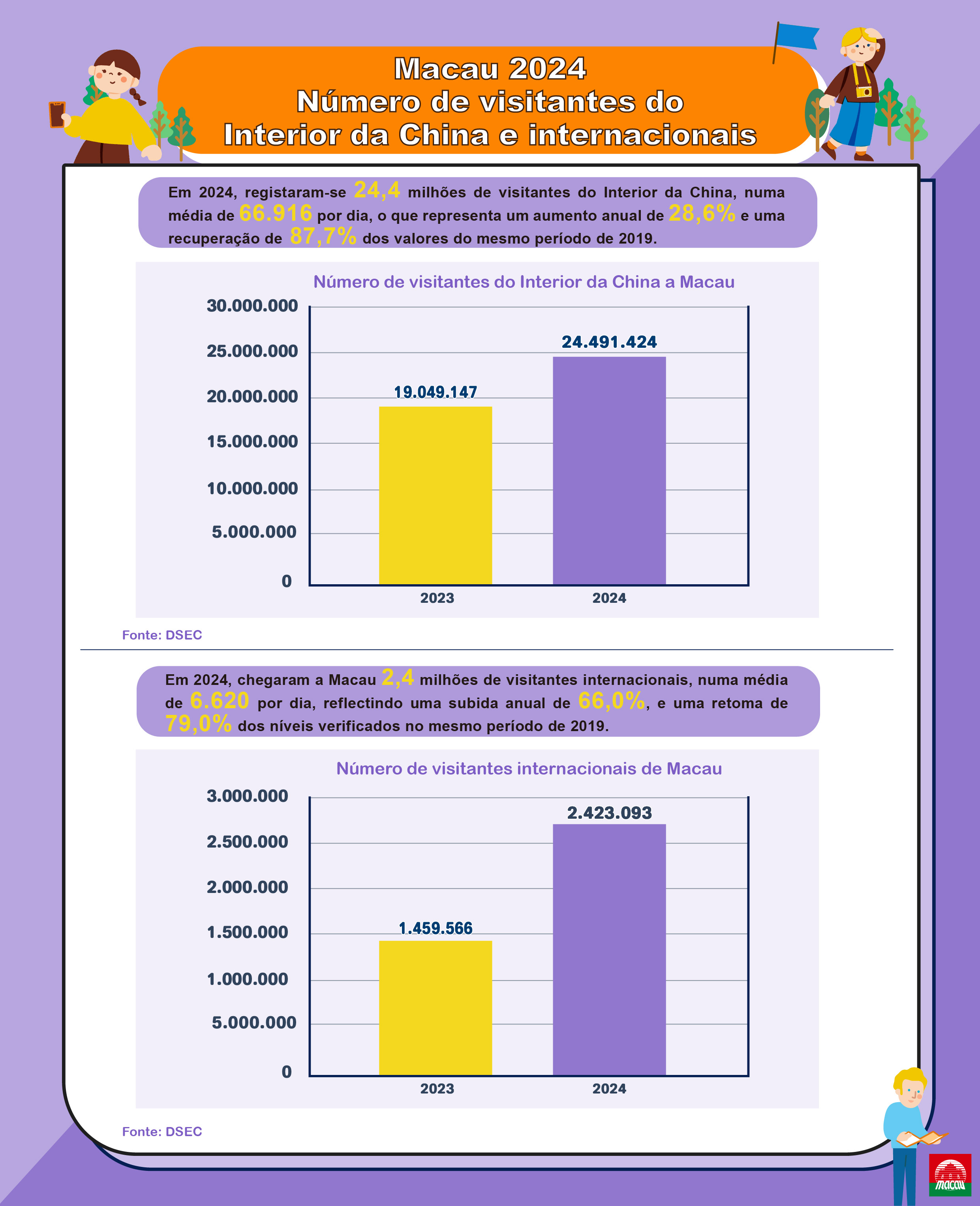 Aproveitando as vantagens próprias, conjugadas com as medidas de apoio a Macau lançadas pelo Governo Central no ano passado e os esforços conjuntos de toda a sociedade, o desenvolvimento da indústria turística de Macau tem vindo a registar uma tendência positiva. Macau registou mais de 34,9 milhões de visitantes (34.928.650) em 2024, um aumento anual de 23,8%, tendo o número de visitantes retomando 88,6% dos valores de 2019, antes da pandemia. O número de visitantes internacionais aumentou 66,0%, atingindo 2,42 milhões (2.423.093), recuperando para 79% dos níveis de 2019.
