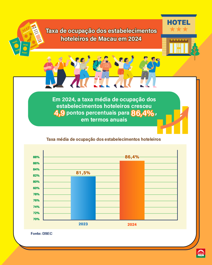 Os estabelecimentos hoteleiros registaram uma subida anual da taxa de ocupação média em 4,9 pontos percentuais, atingindo 86,4%. A taxa de ocupação média dos hotéis de 5 estrelas (88,6%), a dos hotéis de 4 estrelas (82,3%) e a dos hotéis de 3 estrelas (83,8%) aumentaram 6,1, 3,1 e 3 pontos percentuais, respectivamente. Os hotéis registaram um aumento anual de 6,4% do número de hóspedes, num total de 14.433.000, sendo que o número de hóspedes internacionais (1.108.000) cresceu 57,4%, em termos anuais, e que o período médio de permanência dos hóspedes se manteve em 1,7 noites.