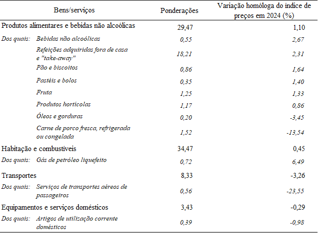 Por seu turno, o índice de preços da secção dos transportes (cuja ponderação é de 8,33) diminuiu 3,26%, em termos anuais, devido principalmente ao índice de preços dos serviços de transportes aéreos de passageiros (cuja ponderação é de 0,56) ter descido 23,55%. O índice de preços da secção dos equipamentos e serviços domésticos (cuja ponderação é de 3,43) também diminuiu 0,29%, em termos anuais, designadamente, o índice de preços dos artigos de utilização corrente domésticos (cuja ponderação é de 0,39) desceu 0,98%. As diminuições dos índices de preços dos referidos bens/serviços atenuaram parte do crescimento do IPC Geral médio em 2024.