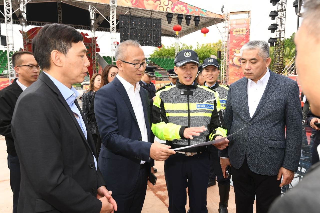 Com a aproximação do Ano Novo Lunar, Macau será palco de uma série de actividades festivas, prevendo uma grande afluência de público e ao mesmo tempo a existência de potenciais riscos de segurança. No sentido de assegurar a ordem pública da região durante o Ano Novo Chinês, bem como proteger a segurança da vida e dos bens dos residentes e turistas, os dirigentes e chefias dos serviços da área de segurança, juntamente com a Direcção dos Serviços de Turismo, o Instituto Cultural (IC), o Instituto para os Assuntos Municipais (IAM) e a Direcção dos Serviços para os Assuntos de Tráfego (DSAT), efectuaram ontem (23 de Janeiro), vistorias aos trabalhos de segurança a implementar nos locais de realização de eventos e ouviram sobre o andamento desses trabalhos.