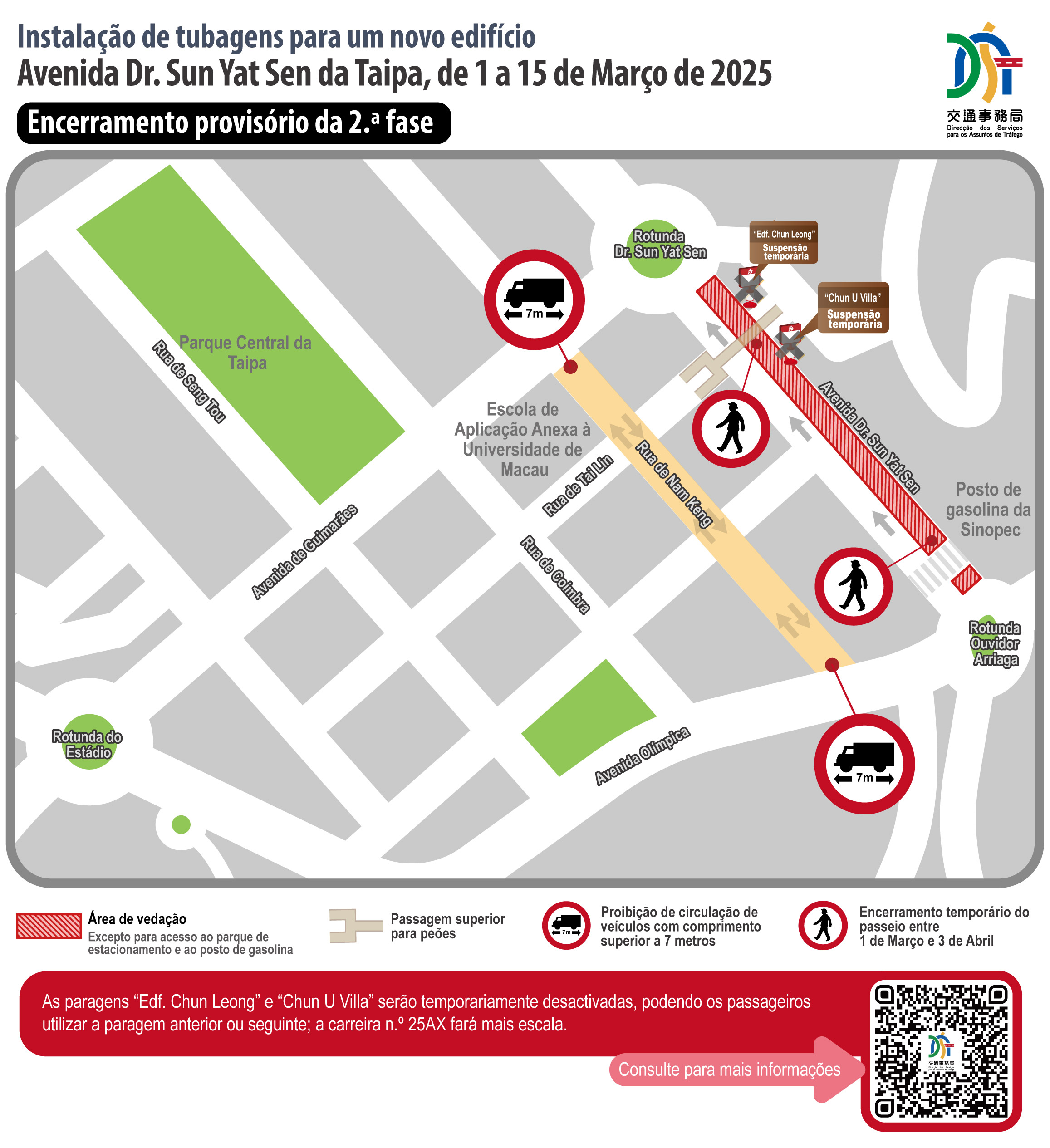 Devido à execução de obras de ligação à rede de tubagens, decorrentes da conclusão de um novo edifício privado, serão implementadas medidas provisórias de trânsito na Avenida Dr. Sun Yat Sen, na Taipa. O encerramento ao trânsito será realizado em duas fases: a 1.ª fase foi concluída com 1 dia de antecedência em relação ao previsto, e a 2.ª fase será antecipada, decorrendo de 1 a 15 de Março. Durante este período, o troço da Avenida Dr. Sun Yat Sen entre a Rotunda Ouvidor Arriaga e a Rotunda Dr. Sun Yat Sen (em direcção à Rotunda Ouvidor Arriaga) será vedado ao trânsito, enquanto a faixa de rodagem, no sentido contrário, da Avenida Dr. Sun Yat Sen (em direcção à Rotunda Dr. Sun Yat Sen) será reaberta ao trânsito. Relativamente aos autocarros, a paragem “Treasure Garden” retomará o serviço após o início da 2.ª fase do encerramento ao trânsito (previsto para as 10h00 de 1 de Março), enquanto as paragens “Edf. Chun Leong” e “Chun U Villa” serão temporariamente desactivadas devido às obras.