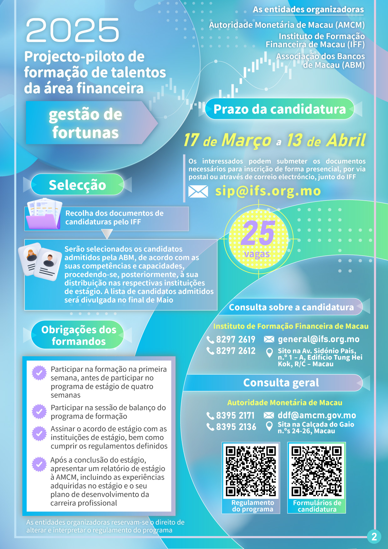 Com vista a coadunar com a estratégia de desenvolvimento da diversificação adequada da economia "1+4" do governo da RAEM, cultivar e reservar talentos profissionais necessários para novas áreas de actividades financeiras modernas, a Autoridade Monetária de Macau (AMCM) continua a lançar no verão do ano de 2025, em conjunto com o Instituto de Formação Financeira de Macau e a Associação de Bancos de Macau, o “Projecto-piloto de formação de talentos da área financeira – gestão de fortunas” (adiante designado por “projecto-piloto”), tendo como objectivo fornecer formação sistemática e direcionada, bem como oportunidades de estágio para estudantes interessados em seguir uma carreira em gestão de fortunas, permitindo assim melhorar a sua adaptabilidade e competitividade no trabalho, estando abertas as inscrições para o projecto-piloto a partir de hoje até 13 de Abril de 2025.
