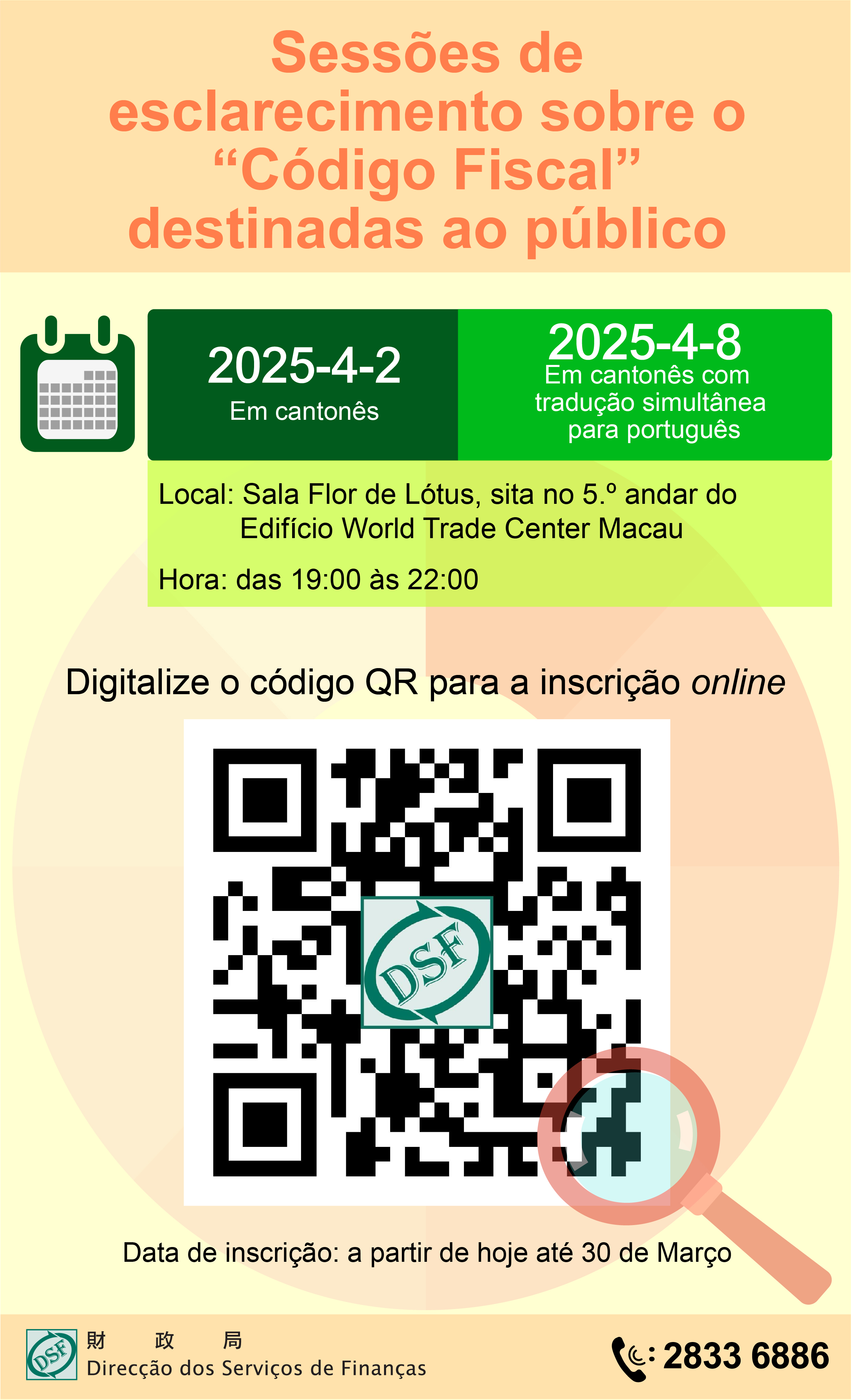 As duas sessões de esclarecimento têm lugar, respectivamente, nos dias 2 e 8 de Abril de 2025, das 19:00 às 22:00 horas, na Sala Flor de Lótus, sita no 5.º andar do Edifício World Trade Center Macau, na Avenida da Amizade n.º 918, em Macau. A 1.ª sessão de esclarecimento será conduzida em cantonês, enquanto a 2.ª sessão será conduzida em cantonês com tradução simultânea para português. Os cidadãos estão convidados a inscrever-se online a partir de hoje até 30 de Março, através da “Página Temática do Código Fiscal” https://cf.dsf.gov.mo. Cada sessão tem um limite máximo de 300 participantes, sendo as vagas preenchidas por ordem de chegada.