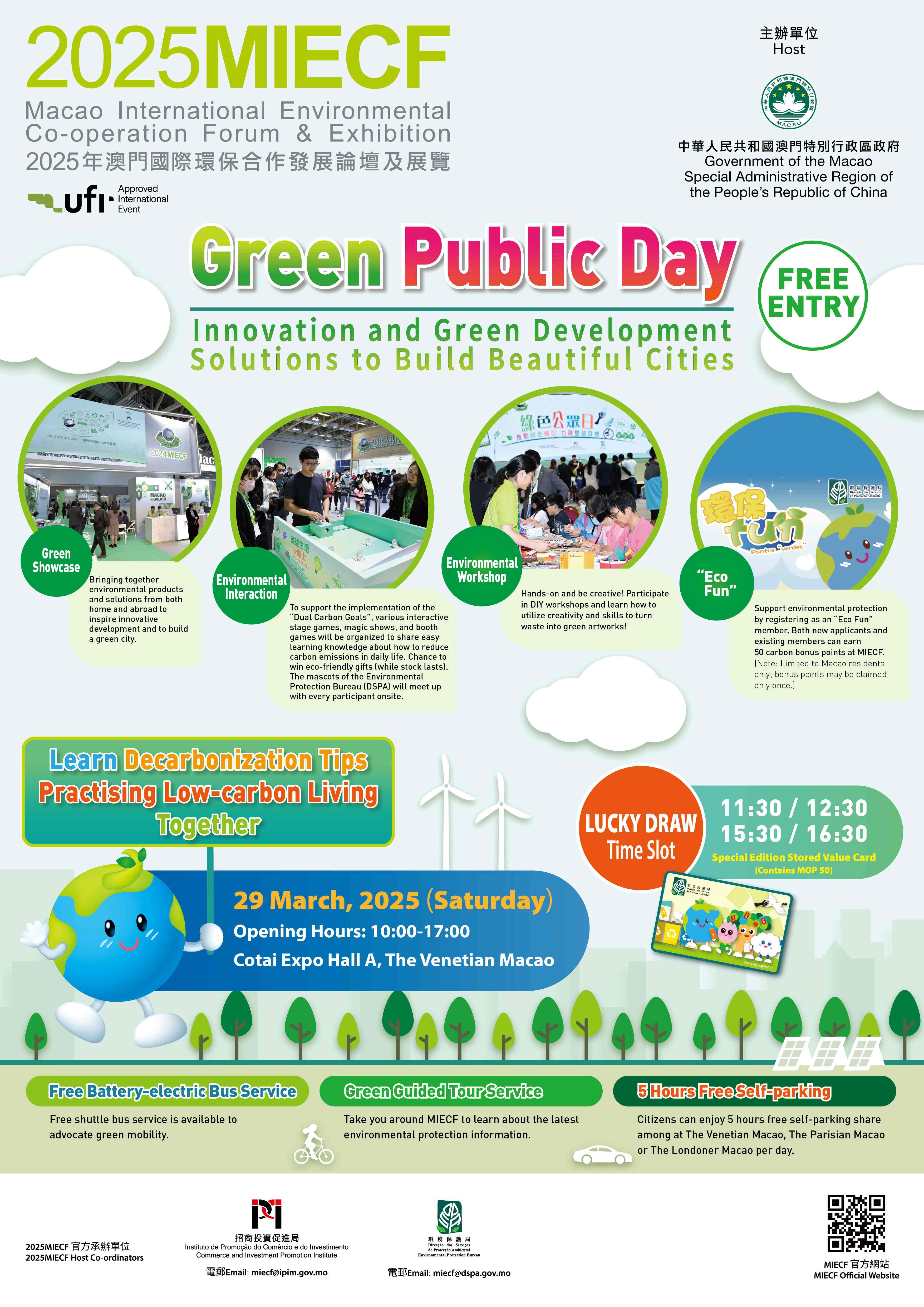 Por forma a promover a participação de todos na mobilidade verde, no Dia Verde do Público, a entidade organizadora disponibilizará quatro carreiras de autocarros eléctricos que estarão a circular entre as Zonas Centro e Norte de Macau, a Taipa e o recinto do MIECF. Esta medida ecológica encoraja os residentes a agirem em conjunto para reduzir as emissões de carbono e a compartilharem a conveniência dos transportes amigos do ambiente.