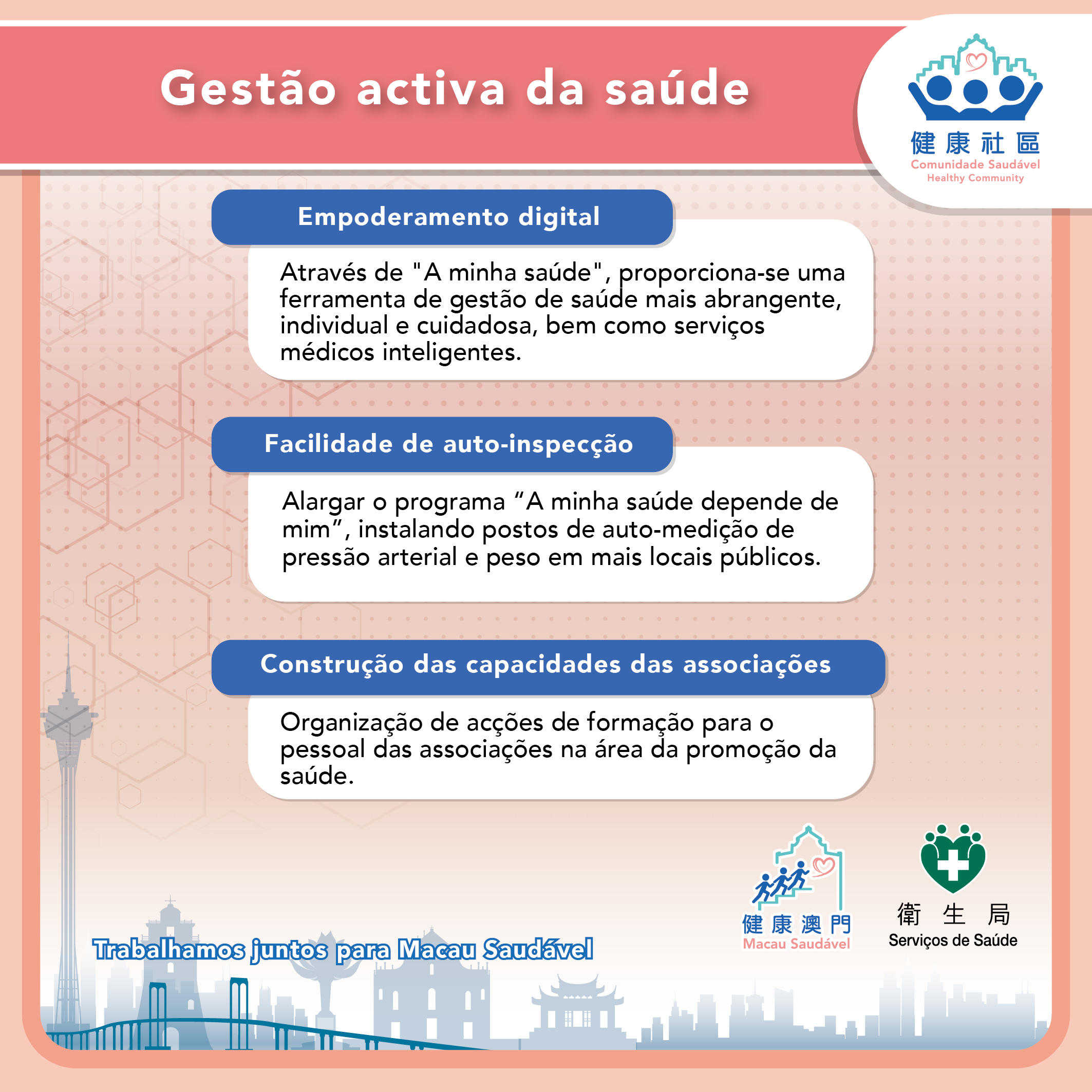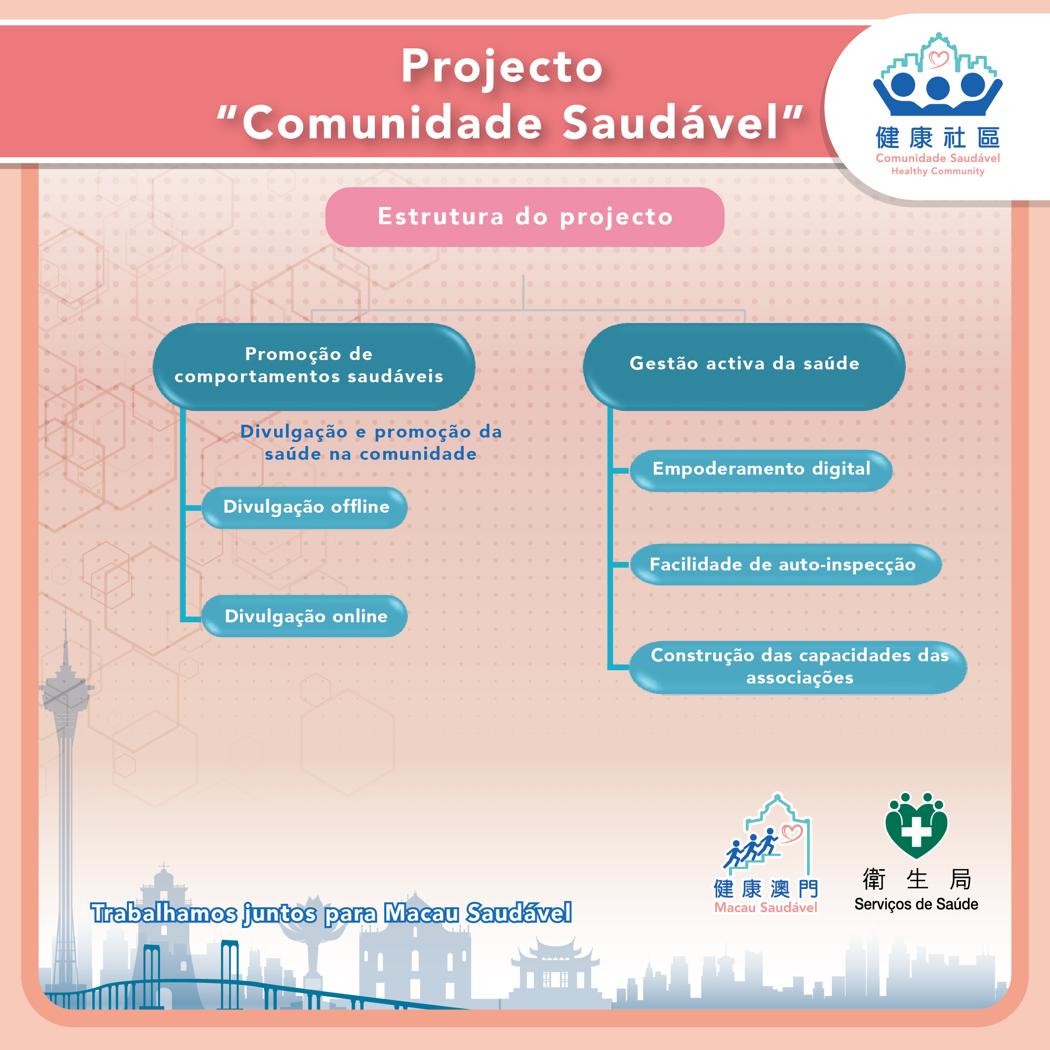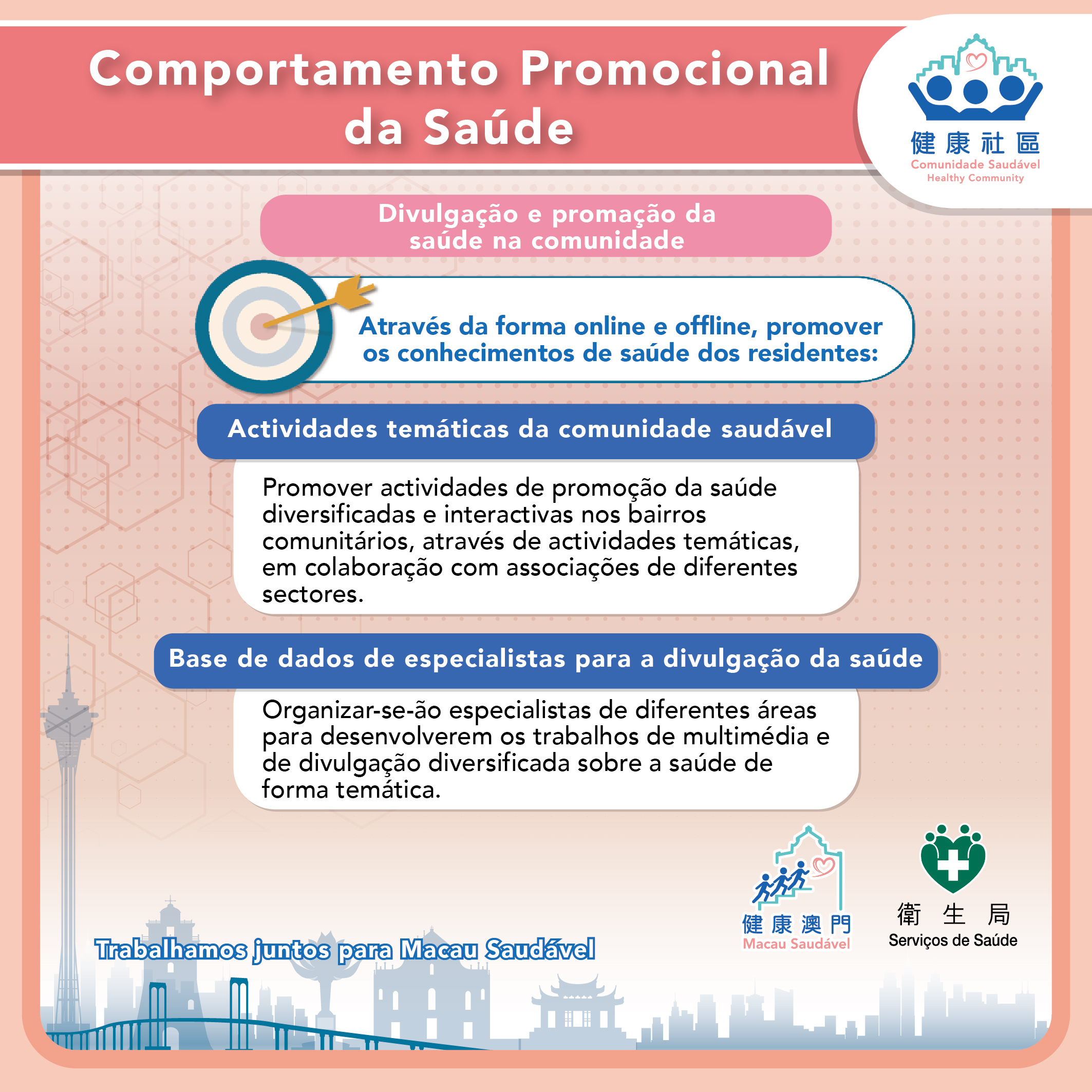 O programa "Comunidade Saudável" desenvolve os seus trabalhos em duas direcções principais. No que diz respeito à "promoção de comportamentos saudáveis", através da combinação de métodos online e offline, promover-se-á a divulgação de conhecimentos científicos sobre a saúde na comunidade, defender-se-á um estilo de vida saudável e reforçar-se-á a prevenção de doenças e a divulgação de informações sobre a saúde psicológica. As “Actividades Temáticas para a Comunidade Saudável” realizadas de forma offline e com temas mensais diversificados, interactivos e directamente relacionados com as necessidades dos residentes, incluem: Posto comunitário de consulta de grande dimensão, carnaval, workshop, teste de saúde e actividades de tendinhas, entre outros. Em Janeiro do corrente ano, em colaboração com 11 associações e instituições médicas, foram instalados 15 postos comunitário de atendimento e informação para prevenção da gripe, que contaram com a participação de mais de 15 mil pessoas. Em Fevereiro, sob o tema de “Dicas para uma alimentação saudável e viagens ao exterior durante o Ano Novo Lunar”, várias associações e instituições de serviços sociais uniram-se para a realização do banquete do Ano Novo Chinês, integrando a sessão de generalização da alimentação saudável, foram realizadas 25 sessões de divulgação sobre técnicas de alimentação saudável durante o Ano Novo Lunar, contando com a participação de mais de 2.700 pessoas. Além disso, através da cooperação interdepartamental, serão transmitidas dicas sobre viagens ao exterior nos ecrãs dos oito postos fronteiriços marítimos, terrestres e aéreos de Macau, alertando para a prevenção de doenças nas viagens ao exterior durante o Ano Novo Chinês. Entre Março e Dezembro, serão realizadas sucessivamente actividades offline com diferentes temas de saúde, incluindo a segurança dos medicamentos, a prevenção da febre de dengue, a prevenção dos malefícios do tabaco, a saúde psicológica, a saúde das crianças, a saúde dos idosos, a saúde das mulheres, etc. Por outro lado, foi criada uma “Base de Dados de Especialistas para a Popularização das Ciências da Saúde” online, reunindo especialistas de diversas áreas, incluindo médicos, enfermeiros, médicos de medicina tradicional chinesa, dentistas, nutricionistas, psicoterapeutas, fisioterapeutas, entre outros. Através de entrevistas com especialistas, vídeos curtos, entre outras formas multimédia, em articulação com a divulgação nas redes sociais, transmitindo informações de saúde e dicas práticas.