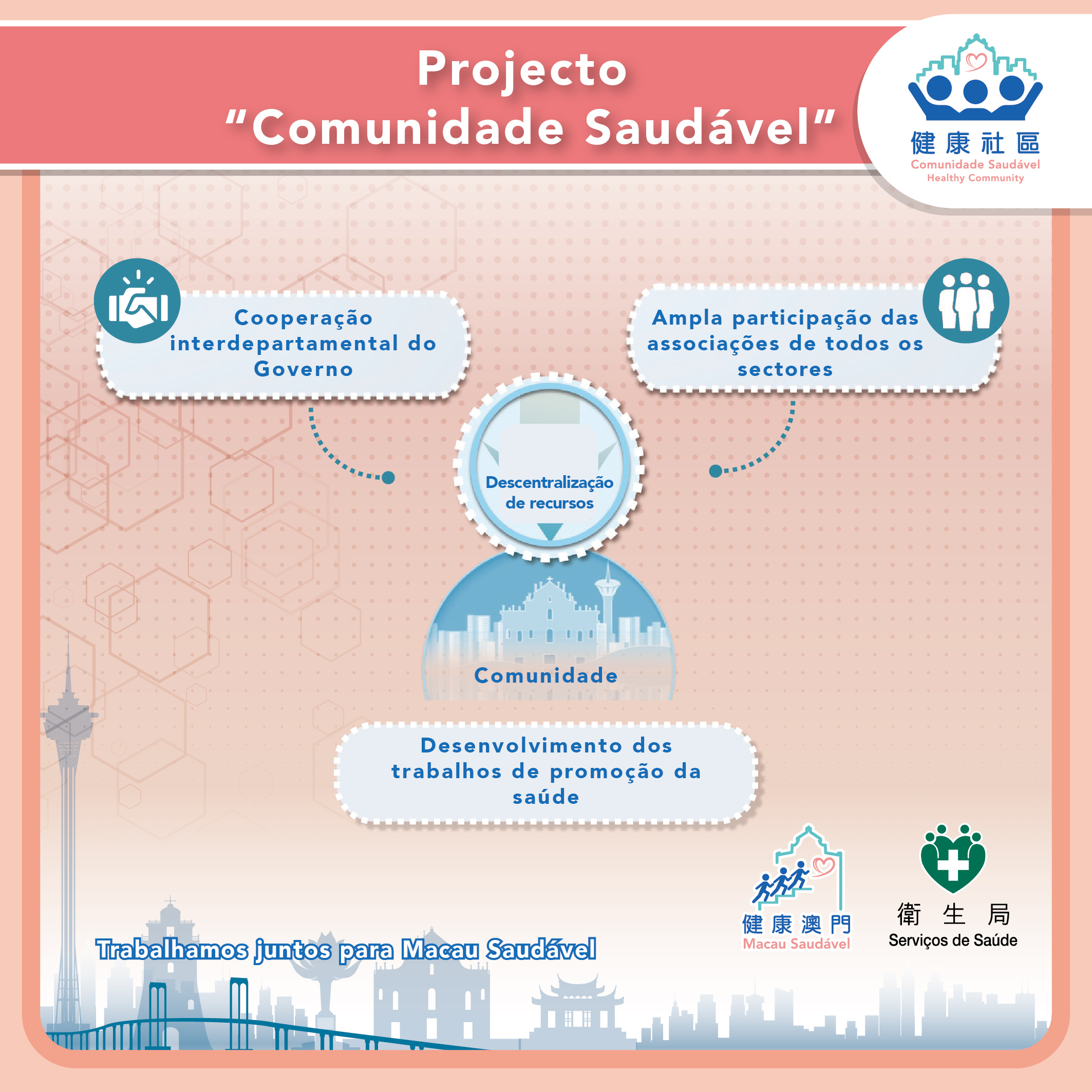 No discurso proferido na cerimónia de lançamento, o Director Lo Iek Long referiu que, desde o 18º Congresso Nacional do Partido Comunista da China, o País tem sempre colocado a “protecção da saúde da população” na posição estratégica de desenvolvimento prioritário, promovendo activamente a construção de uma “China saudável”. Do mesmo modo, o Governo da RAEM também atribui grande importância à saúde física e mental dos residentes. Actualmente, as doenças crónicas, tais como a hipertensão, a diabetes e os tumores, são os principais factores que afectam a saúde e a vida dos residentes de Macau. 70% das doenças crónicas podem, através de um estilo de vida saudável, apoiar um ambiente saudável, bem como medidas e políticas favoráveis à saúde para a prevenção e controlo. O Programa “Comunidade Saudável”, através da cooperação interdepartamental do Governo, articulará amplamente com as forças das associações e instituições dos diversos sectores, desenvolvendo sinergias e focando-se na promoção de comportamentos saudáveis e na gestão proactiva da saúde, em simultâneo, em estreita articulação com os programas existentes de “Empresas Saudáveis” e de “Escolas Saudáveis”, concretizaremos, em conjunto, os objectivos do “Plano de Acção para Macau Saudável”, a partir de três aspectos: A vida, o trabalho e a aprendizagem dos residentes, elevando o nível de saúde, a sensação de ganho e felicidade dos residentes, injectando uma nova vitalidade na “Macau Feliz”. O lançamento deste programa demonstra a determinação do Governo e dos diversos sectores da sociedade, especialmente das associações e instituições na criação conjunta de uma “Macau saudável”, abrindo um novo capítulo na concretização do “descentralizar recursos” no sistema de saúde de Macau.