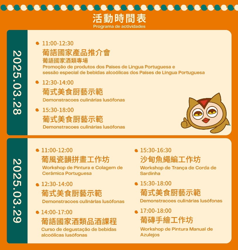 O evento também incluirá várias actividades empolgantes focadas na cultura dos PLP e nos seus produtos característicos. No primeiro dia, haverá uma promoção de produtos alcoólicos dos PLP, reunindo uma variedade de vinhos dos PLP e centrando-se nas negociações comerciais; será realizada uma demonstração culinária de pratos portugueses, com a participação de chefes de cozinha de Macau, influentes na internet, que irão cozinhar no local iguarias portuguesas como galinha à portuguesa e pastéis de batata.