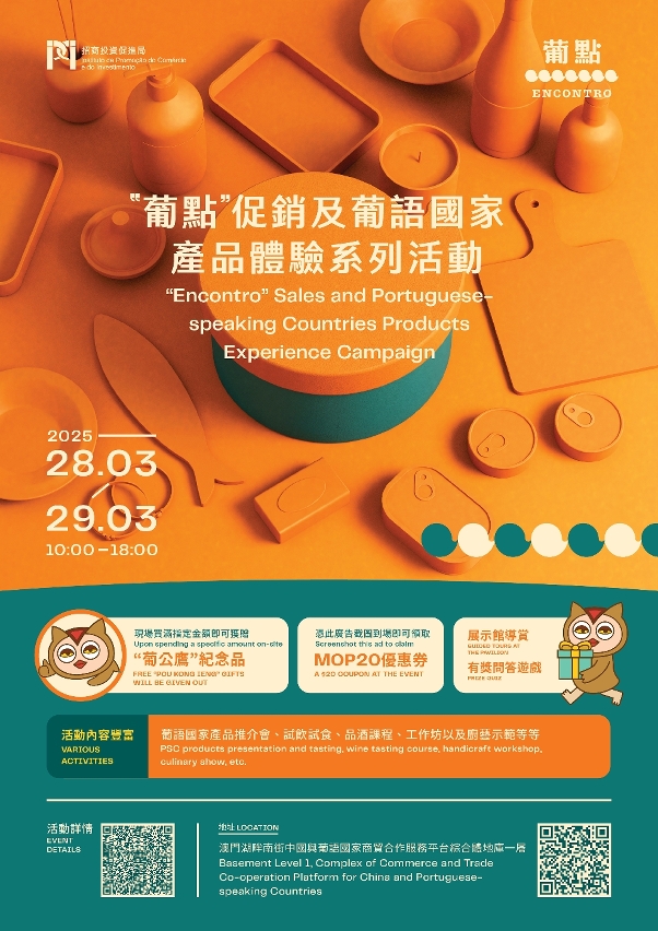 Com o objectivo de proporcionar ao público oportunidades de experimentar de perto o encanto único dos produtos e da cultura dos Países de Língua Portuguesa (PLP), o Instituto de Promoção do Comércio e do Investimento (IPIM) irá estrear as actividades promocionais no “Encontro” e uma série de actividades sobre experiência dos produtos dos Países de Língua Portuguesa. O Encontro, localizado na cave 1 do Complexo da Plataforma de Serviços para a Cooperação Comercial entre a China e os Países de Língua Portuguesa, apresentará e colocará à venda mais de 350 produtos de qualidade dos PLP e a preços acessíveis. Ao mesmo tempo, serão também realizados 10 workshops, cursos de degustação de bebidas alcoólicas, demonstrações culinárias e promoções de produtos. Convidamos o público a visitar o evento ou a inscrever-se nos workshops através do link (https://wk.wkebcc.com/index/h5/gzfsignup).