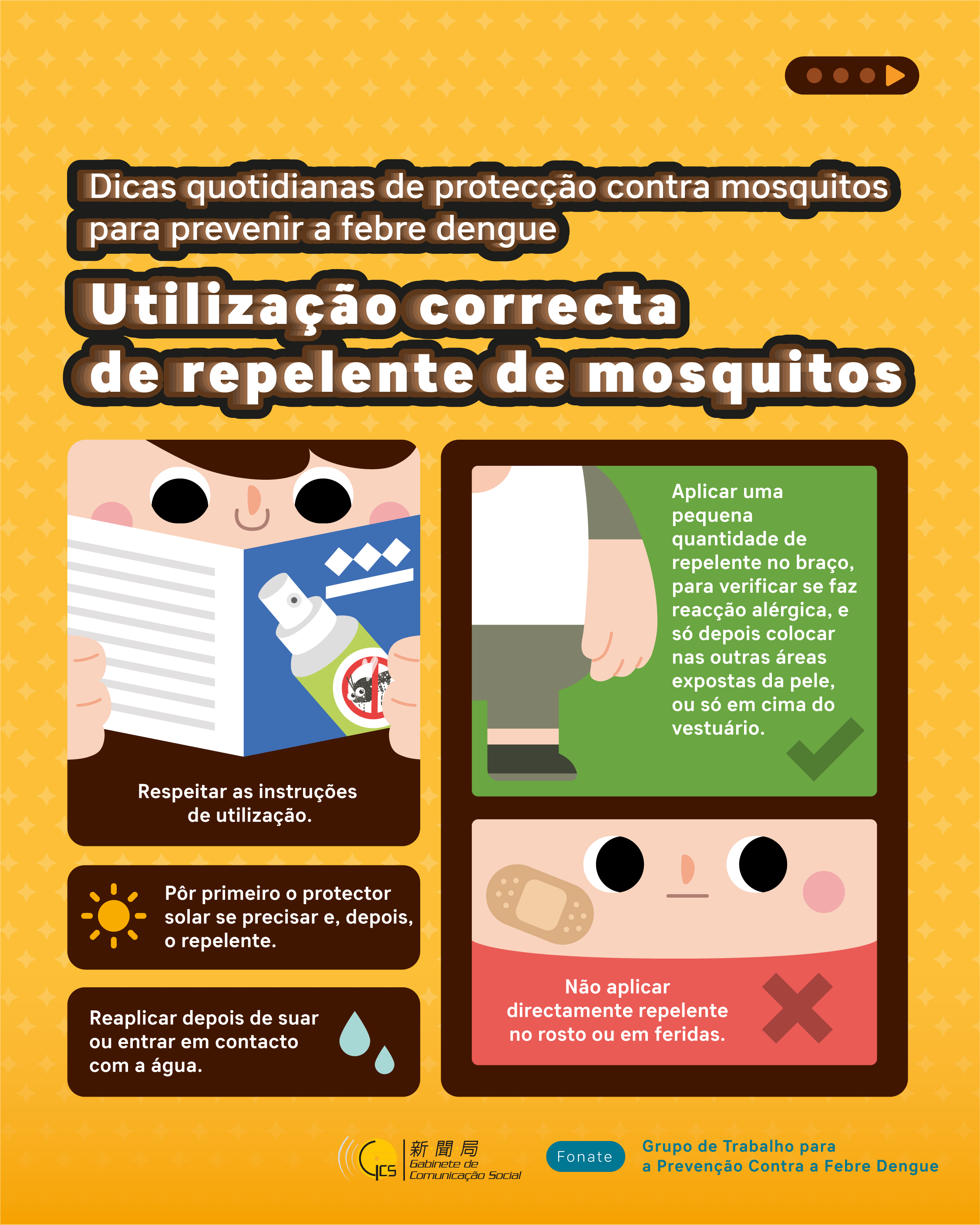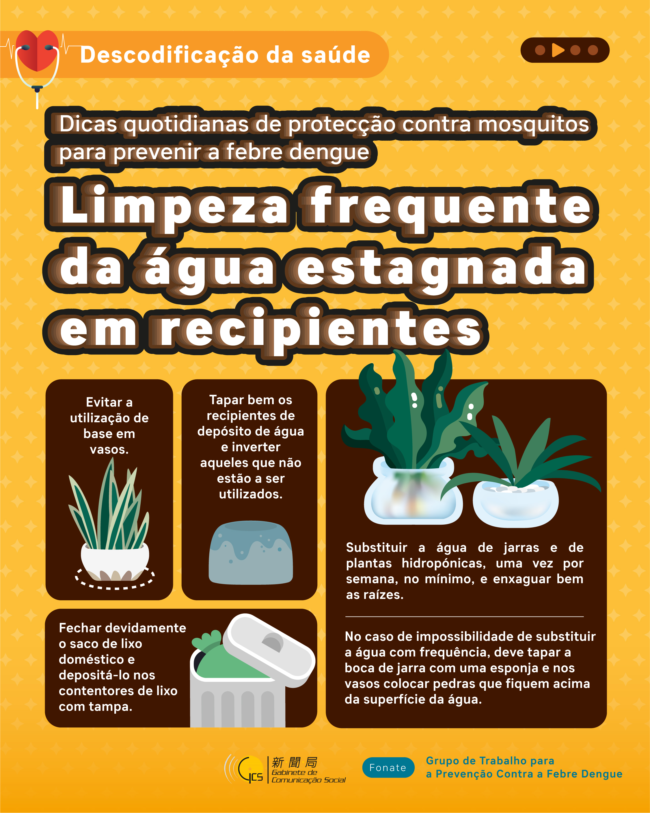Em 2024, a situação epidémica da Febre de Dengue a nível mundial e nas zonas vizinhas de Macau foi considerada grave, dentro dos quais, registou-se mais de 6,6 milhões casos no Brasil, 340.860 casos nas Filipinas, 210.644 casos na Indonésia, 122.423 casos na Malásia, 75.919 casos na Tailândia, 17.757 casos na província de Guangdong, 161 casos em Hong Kong, 9 casos locais e 39 casos importados em Macau, demonstrando que o risco de propagação através de casos importados é bastante alto. O Grupo de Trabalho apela à população para continuar atenta à eliminação da água estagnada em casa e as medidas de prevenção pessoal de mosquitos.