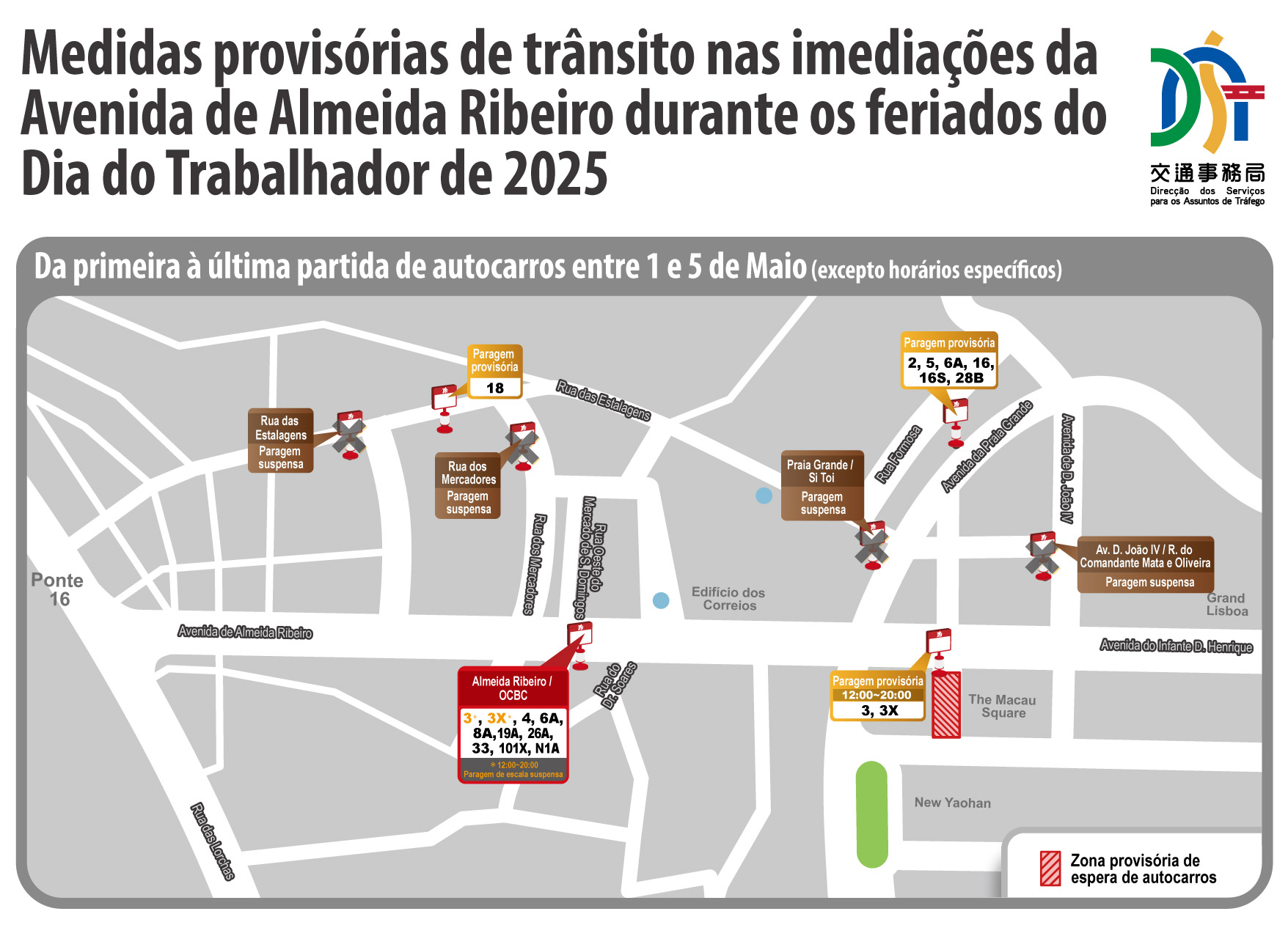 Em resposta às necessidades de deslocação dos residentes e turistas durante os feriados do Dia do Trabalhador, a Direcção dos Serviços para os Assuntos de Tráfego (DSAT), em coordenação com o Corpo de Polícia de Segurança Pública (CPSP), os Serviços de Alfândega (SA), o Instituto para os Assuntos Municipais (IAM), as operadoras de autocarros, o transporte transfronteiriço de passageiros, as operadoras de jogo, os hotéis e a empresa de gestão do lado este da Praça das Portas do Cerco, planeou os condicionamentos de trânsito e os planos de contingência. Entre 30 de Abril (quarta-feira) e 5 de Maio (segunda-feira), serão implementadas várias medidas provisórias de trânsito nos postos fronteiriços de Macau e em locais onde se prevê um grande fluxo de pessoas e veículos. Também será reservada uma área nos postos fronteiriços para a tomada-largada de passageiros de autocarros shuttle dos hotéis e casinos.