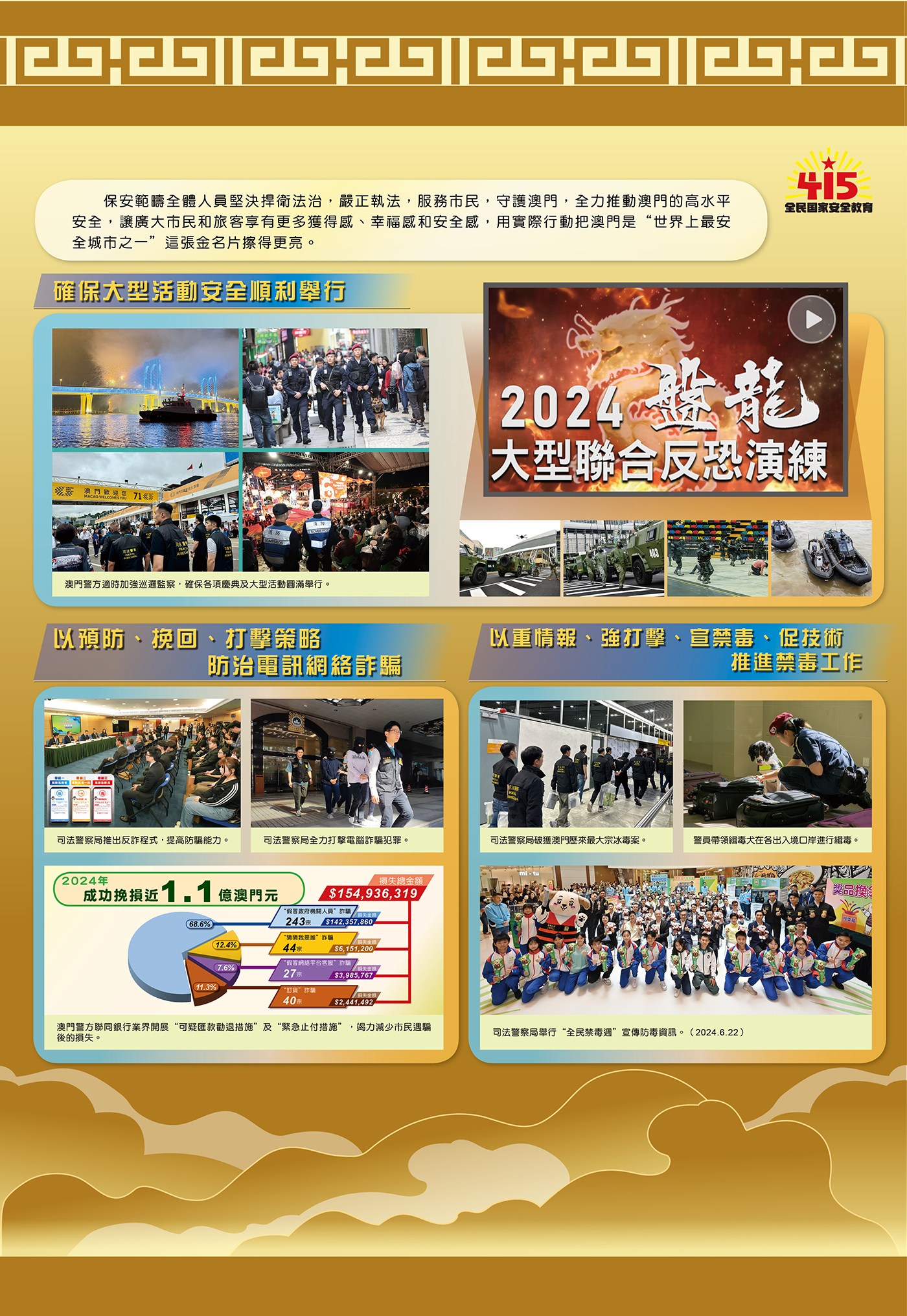Nos últimos dez anos, sob a orientação da Perspectiva Geral da Segurança Nacional, a educação da segurança nacional na RAEM tem aprofundado de forma constante e conseguiu resultados notáveis, tem aumentado a consciência de segurança nacional de toda a população, tem contribuído para a transmissão entre as gerações da tradição do amor à Pátria e a Macau. A Exposição sobre a Educação da Segurança Nacional, co-organizada pelo Governo da RAEM e o Gabinete de Ligação do Governo Popular Central na RAEM, realiza-se pela oitava vez, registando, até o dia 1 de Maio, mais de 36 mil visitantes e mais de 92 727 navegações na respectiva página electrónica.