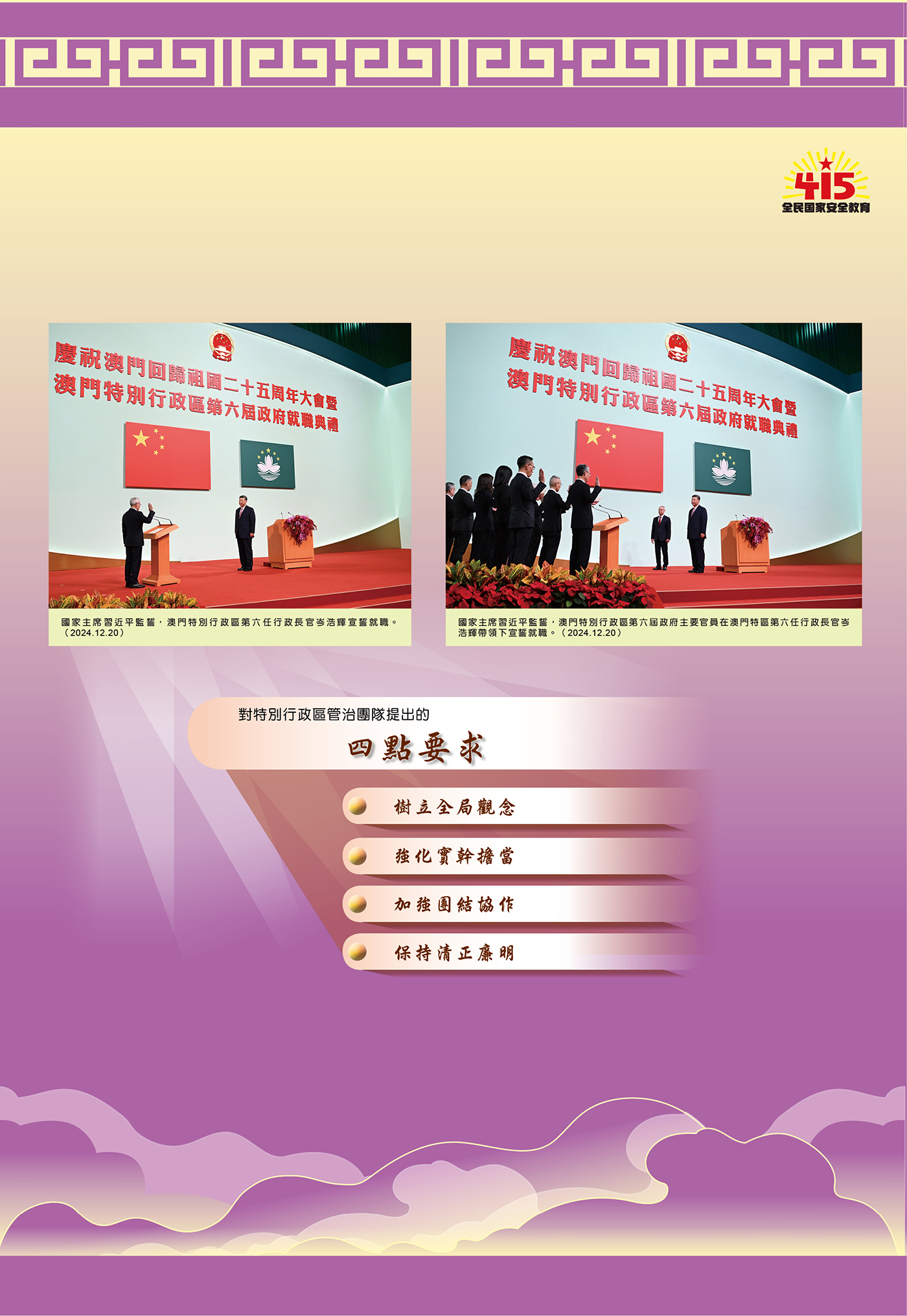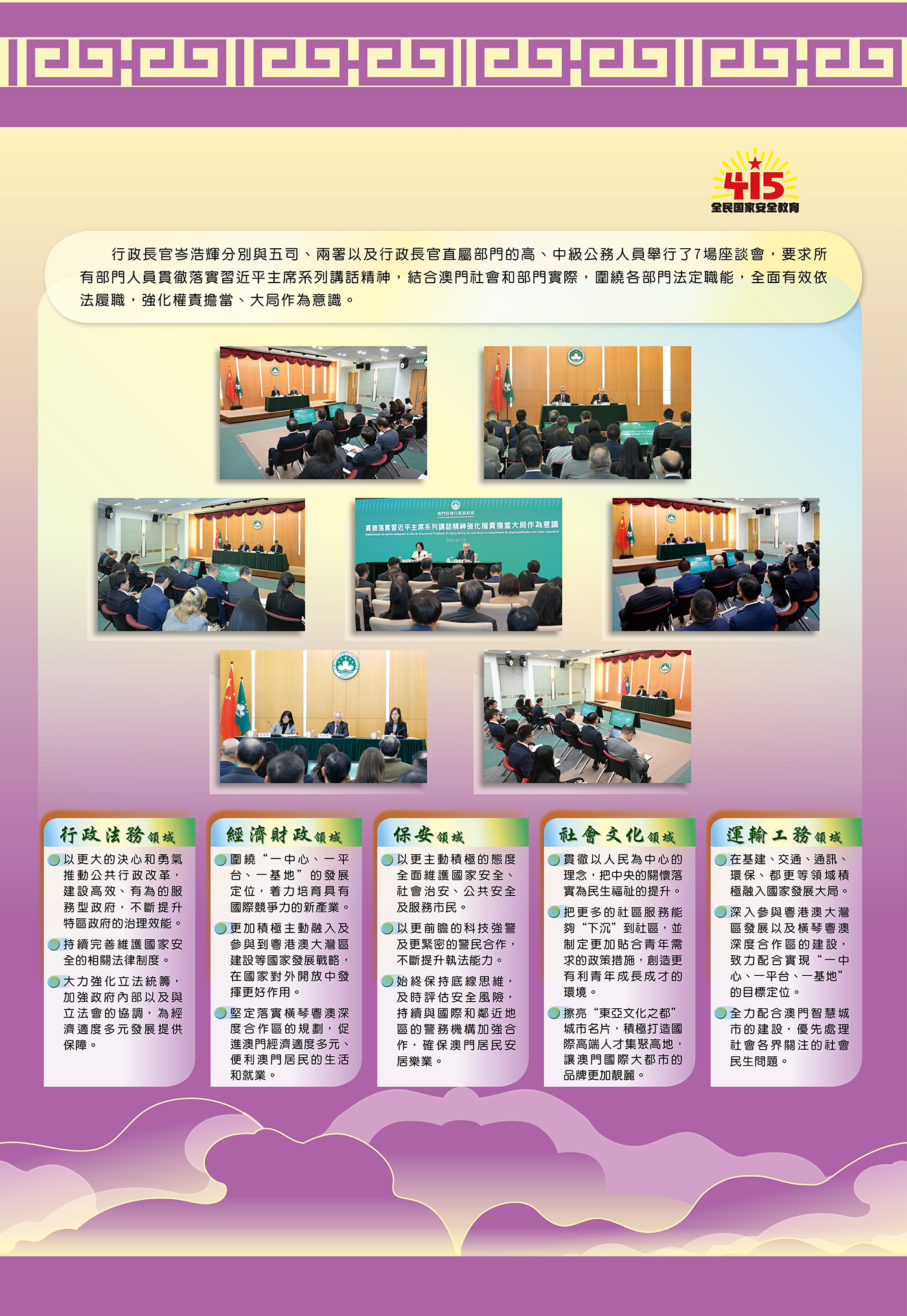 O novo governo da RAEM reuniu e liderou todos os sectores locais para estudar e implementar o espírito consagrado nos discursos importantes do presidente Xi Jinping. O Chefe do Executivo, Sam Hou Fai presidiu sete seminários, respectivamente com os representantes das cinco tutelas e dos Comissariados contra a Corrupção e da Auditoria, e solicitou que os funcionários de todos os serviços públicos estudem e compreendam profundamente os conteúdos, pontos de vista e metodologia dos discursos importantes do presidente Xi Jinping, articulando-os com os seus trabalhos práticos das respectivas áreas, com vista a cumprirem as suas competências efectivamente de acordo com a lei, fortalecerem o seu empenho, responsabilidade e consciência da conjuntura global.