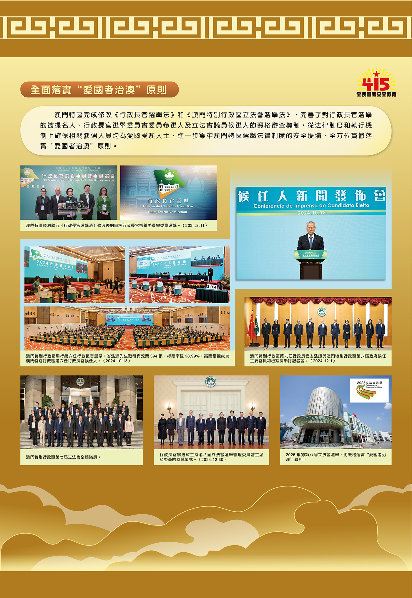 O tema da quarta parte da exposição é «Ter sempre em mente as instruções e assumir responsabilidades - Avançar para um novo patamar de prosperidade e estabilidade social». Sob a orientação renovada e instrução científica da Perspectiva Geral da Segurança Nacional, o governo da RAEM continua a aperfeiçoar o regime jurídico de salvaguarda da segurança nacional, lançou uma série de leis e regulamentos relativos à segurança nacional, e promove a legislação complementar sobre a segurança nacional. A RAEM concluiu as alterações da Lei Eleitoral para o Chefe do Executivo e da Lei Eleitoral para a Assembleia Legislativa da RAEM, garantindo, com base no regime jurídico e ao nível de mecanismo de implementação, que as pessoas que participem nas respectivas eleições sejam patriotas, fazendo com que o princípio de “Macau governado por patriotas” seja concretizado efectivamente. Ao mesmo tempo, o governo da RAEM concretiza activamente a Perspectiva Geral da Segurança Nacional, continua a aperfeiçoar o sistema institucional e o mecanismo de implementação, consolida efectivamente a linha de defesa da segurança nacional.