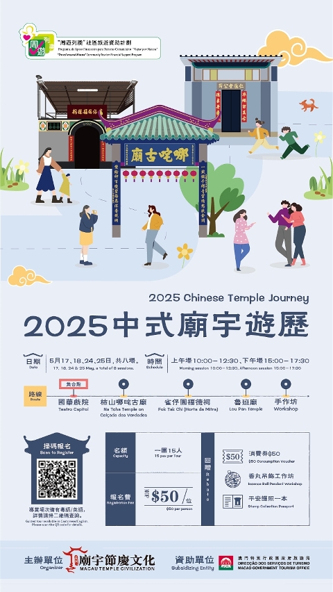 “Explorar Templos Chineses de Macau 2025” terá lugar nos sábados de 17 a 25 de Maio, com uma sessão durante a parte da manhã e outra à tarde. No dia 25 de Maio haverá visitas guiadas em chinês e inglês. Os participantes vão acompanhar os guias numa visita guiada a emblemáticos templos de cultura chinesa da península de Macau - o Antigo Templo de Na Tcha, o Templo Fok Tak Chi do Bairro da Horta da Mitra e o Templo de Lu Ban -, para conhecerem de perto a história e a cultura por detrás dos templos e poderem criar ainda, por si próprios, pequenos objectos com fragrâncias, levando bênçãos para casa.