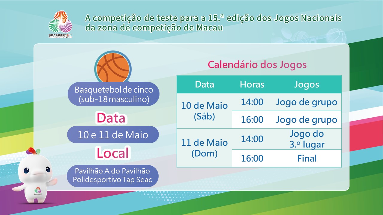 A fim de rever e optimizar todas as etapas do funcionamento das competições, o Gabinete Preparatório para a Organização da Zona de Competição de Macau da 15.ª edição dos Jogos Nacionais e Jogos Olímpicos Especiais para Deficientes irá realizar, nos meses de Maio e Junho, as competições de teste para as 5 modalidades competitivas da 15.ª edição dos Jogos Nacionais. Entre estas competições, os jogos da modalidade de basquetebol de cinco (sub-18 masculino) terão lugar nos dias 10 e 11 de Maio, às 14h00, no Pavilhão Polidesportivo Tap Seac. Este evento irá contar com a participação de equipas de Macau, Zhuhai, Zhongshan e Jiangmen e as equipas serão divididas em 2 grupos por sorteio. As referidas competições estarão abertas a residentes e turistas para que estes possam assistir e experienciar de antemão a atmosfera deste evento dos Jogos Nacionais.