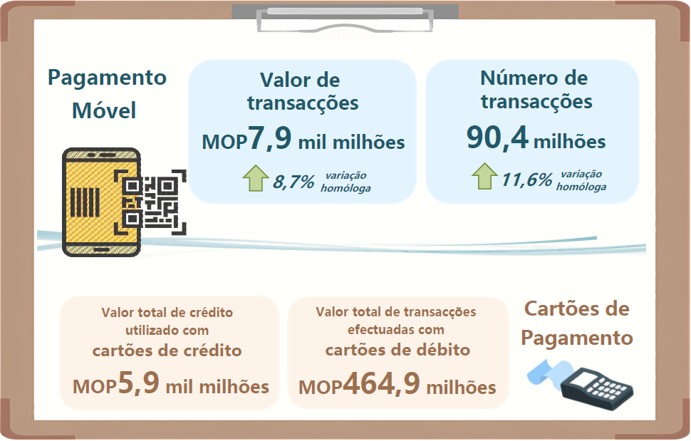 No domínio dos pagamentos móveis locais, o número de transacções realizadas, no primeiro trimestre de 2025, aumentou 11,6% relativamente ao ano anterior, tendo registado 90,4 milhões transacções. O valor das transacções foi de MOP7,9 mil milhões, correspondendo a um acréscimo de 8,7%, quando comparado com o ano anterior. O valor médio por transacção foi de MOP87,8. Até finais de Março de 2025, o número de aparelhos que aceitam o pagamento móvel e os suportes de “QR Code” em Macau atingiu 108.749 unidades.