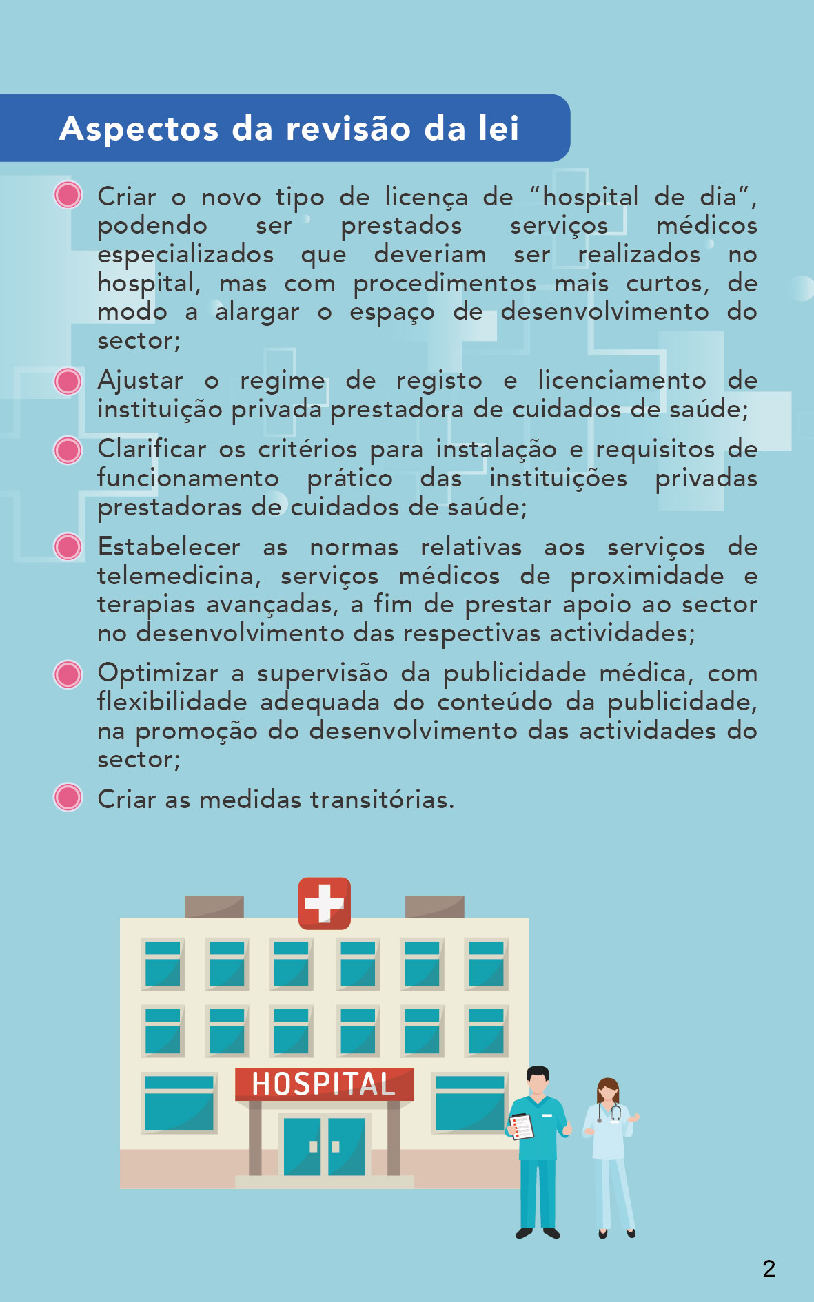 Os participantes concordaram, de um modo geral, com a orientação legislativa do “Regime jurídico para o exercício de actividades das instituições privadas prestadoras de cuidados de saúde” e apresentaram as suas opiniões em relação ao conteúdo do documento de consulta. Alguns participantes consideraram que devem ser claramente definidos os requisitos para a abertura de hospitais e hospitais de dia, incluindo a caução, a área do estabelecimento e a alocação de pessoal, a fim de garantir a qualidade dos serviços médicos; Além disso, houve participantes que apoiaram a produção legislativa para regulamentar claramente os serviços extensivos e de telemedicina, considerando que pode elevar eficazmente a acessibilidade dos cuidados de saúde, para que mais idosos e pessoas com dificuldades de locomoção possam ser beneficiados. Existem também opiniões que concordam que permitir que os hospitais de dia prestem serviços médicos especializados, tais como a terapia celular e a procriação medicamente assistida, o que pode promover eficazmente o desenvolvimento da “saúde + turismo”.