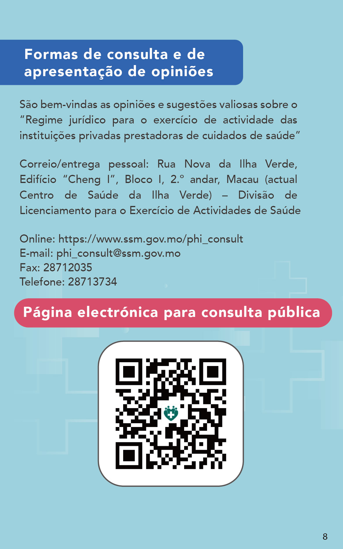 O período de consulta pública decorre até 16 de Maio, os Serviços de Saúde apelam, mais uma vez, à participação activa dos sectores da sociedade, para apresentar, em conjunto, opiniões e sugestões sobre o regime e o desenvolvimento das instituições privadas prestadoras de cuidados de saúde de Macau. Durante esse período, é bem-vinda a apresentação de opiniões através da internet, correio electrónico, fax, correio postal ou pessoalmente. Para mais informações sobre esta consulta pública, queira aceder à página electrónica temática (https://www.ssm.gov.mo/apps1/phi_consult/pt.aspx#clg30688) ou ligar para o telefone n.º 2871 3734.