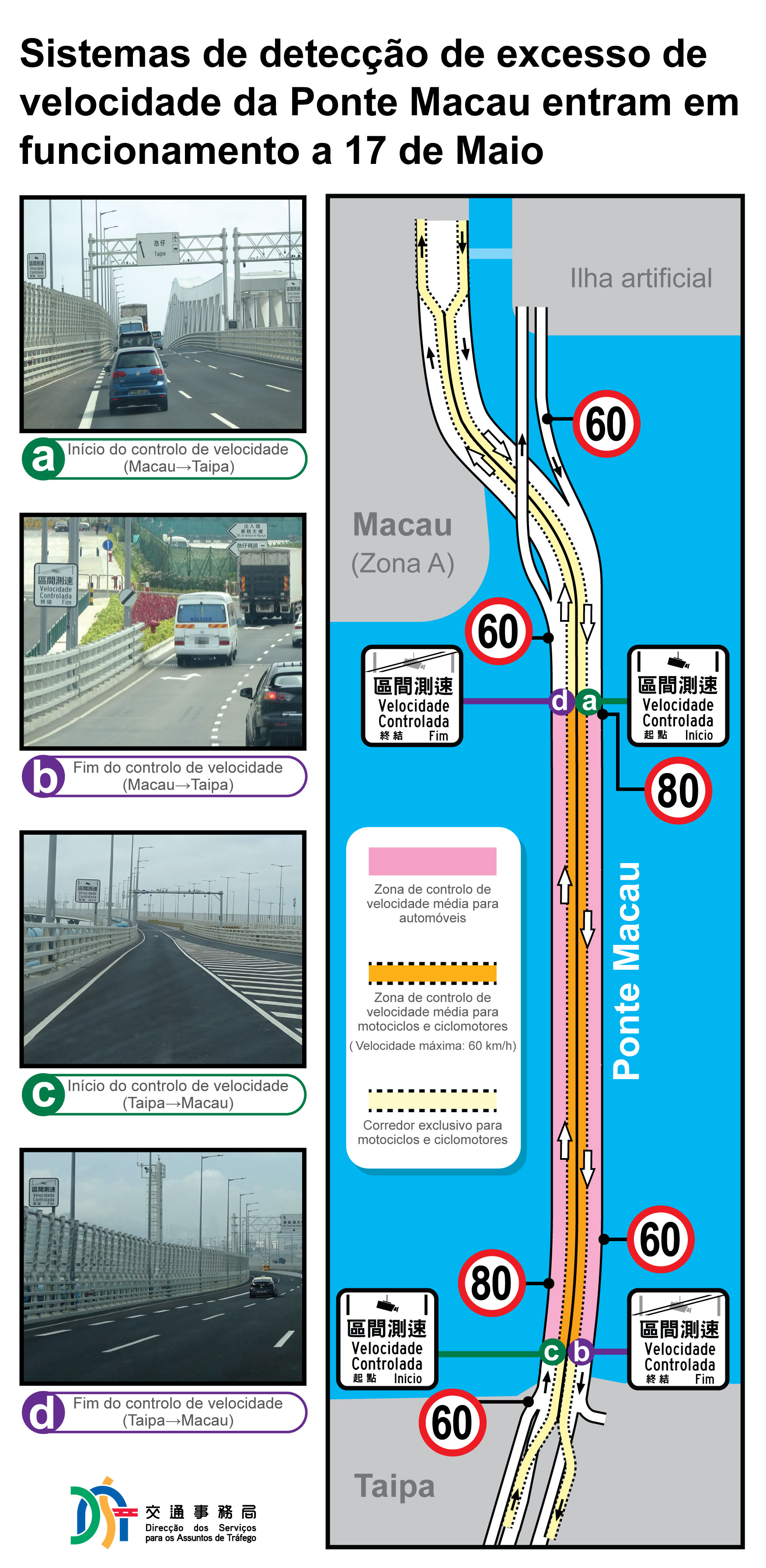 Após aprovação pelo Conselho Superior de Viação e coordenação entre a Direcção dos Serviços para os Assuntos de Tráfego (DSAT) e o Corpo de Polícia de Segurança Pública (CPSP), entrarão em funcionamento, a partir das 00h00 do dia 17 do corrente mês (Sábado), 22 sistemas fixos de detecção de excesso de velocidade e 4 sistemas de detecção de velocidade média, instalados junto aos lados de Macau e da Taipa da ponte principal, nas rampas de Pac On junto à entrada e à saída da ponte principal e no corredor exclusivo para motociclos e ciclomotores, com vista a combater as infracções por excesso de velocidade.