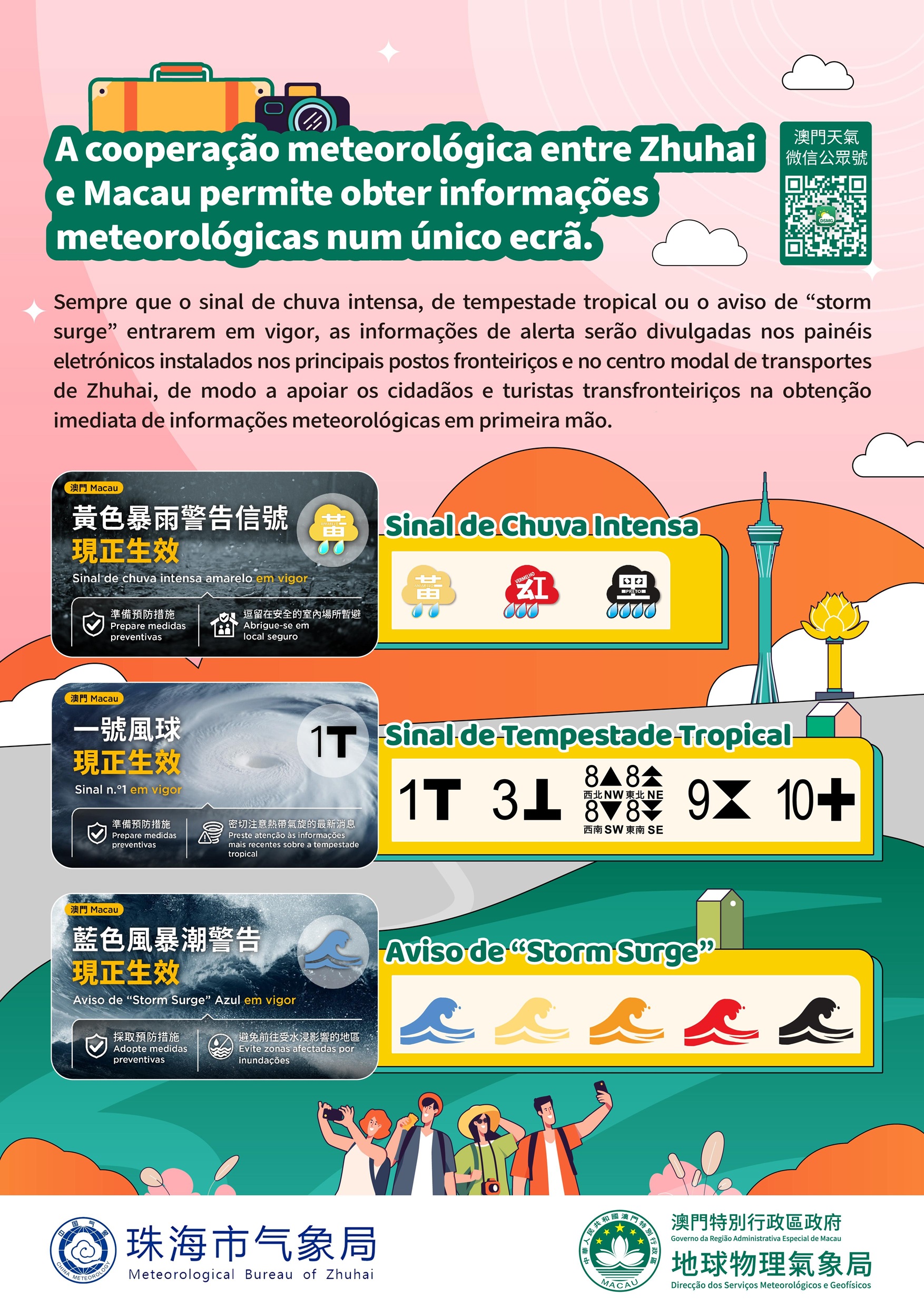 Com o objectivo de promover os serviços meteorológicos da Zona de Cooperação Aprofundada entre Guangdong e Macau, em Hengqin (daqui em diante designada como Zona de Cooperação), a Direcção dos Serviços Meteorológicos e Geofísicos de Macau e Zhuhai Meteorological Bureau lançaram em conjunto a página temática “Alerta Meteorológico Zhuhai-Macau”. Ao mesmo tempo, sempre que o sinal de chuva intensa, de tempestade tropical ou o aviso de “storm surge” entrarem em vigor em Macau, os quinze ecrãs electrónicos instalados nos sete postos fronteiriços e centros modais de transportes da cidade de Zhuhai vão mostrar as mensagens de alerta de Macau para facilitar o conhecimento aos cidadãos, utentes transfronteiriços e turistas das informações de alerta meteorológico de Zhuhai e Macau, de modo a que possam planear melhor a viagem e tomar medidas de resposta.