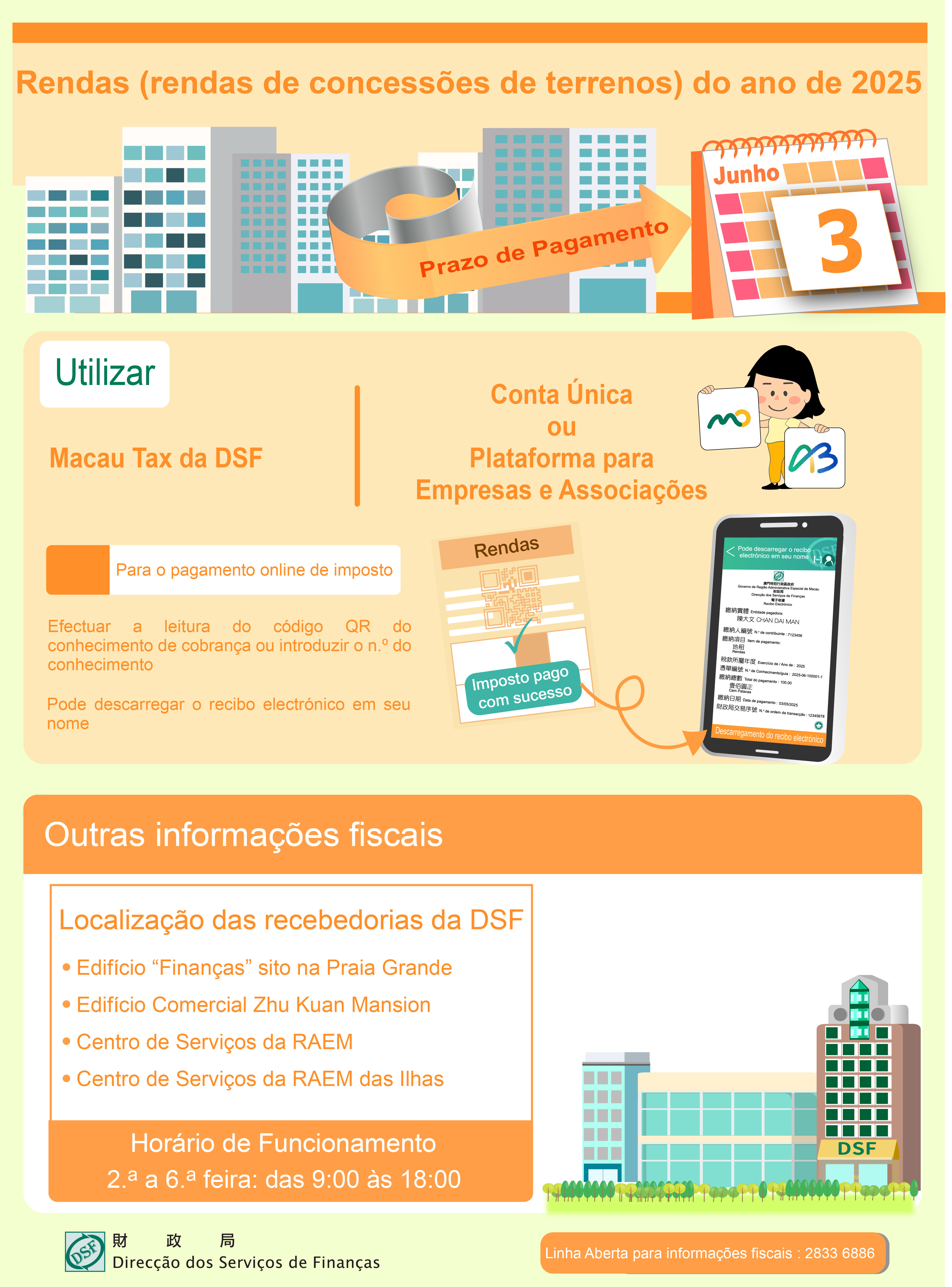 O prazo para o pagamento das rendas (rendas de concessões de terrenos) do ano de 2025 vai até ao dia 3 de Junho, os contribuintes que ainda não efectuaram o pagamento das rendas acima mencionado devem fazê-lo com a maior brevidade possível para evitarem o pagamento fora do prazo e serem sujeitos ao pagamento adicional de juros de mora e multa.