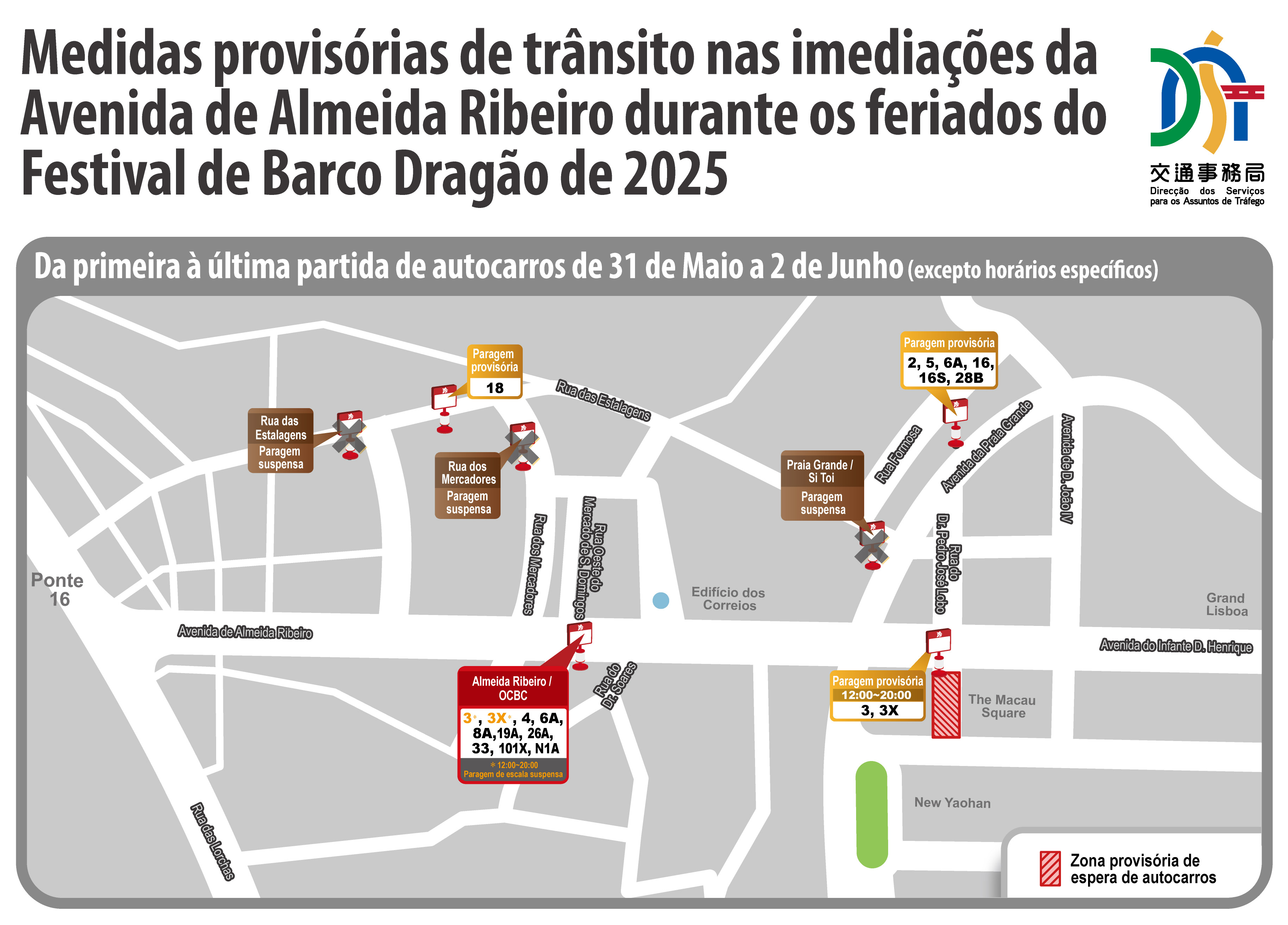No que diz respeito ao serviço de autocarros, tomando como referência os planos de triagem adoptados no passado, haverá medidas provisórias no lado este da Praça das Portas do Cerco e nas imediações da Avenida de Almeida Ribeiro. As duas operadoras irão aumentar as partidas de autocarros e operar as carreiras sazonais n.os 3BX, 17T, 21AT, 26AT durante os dias 31 de Maio a 2 de Junho para acelerar o escoamento de passageiros. Em articulação com essas disposições, será necessário implementar condicionamentos ao trânsito nas vias envolventes (vide o mapa I). Para mais informações sobre as disposições provisórias do serviço de autocarros, podem consultar os mapas II, III e as páginas electrónicas das duas operadoras de autocarros (TCM: http://www.tcm.com.mo e Transmac: http://www.transmac.com.mo).