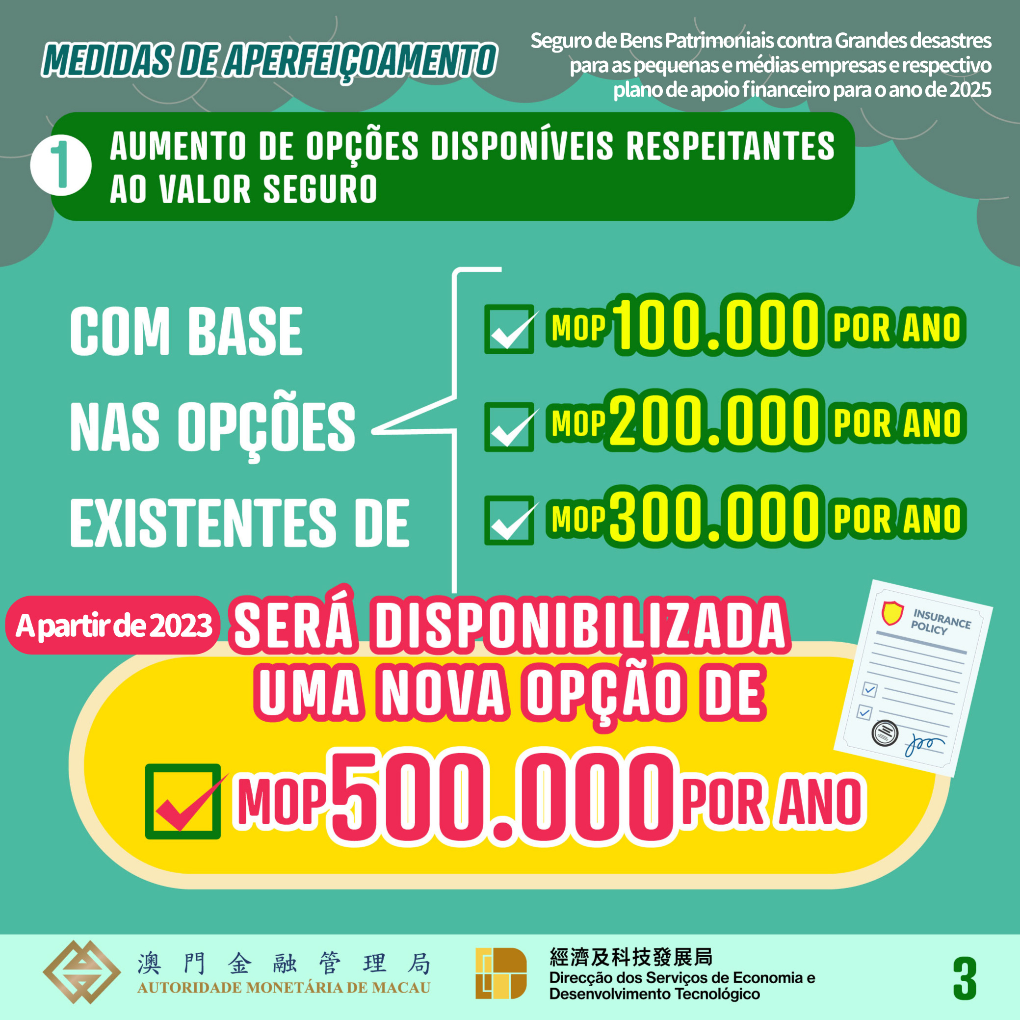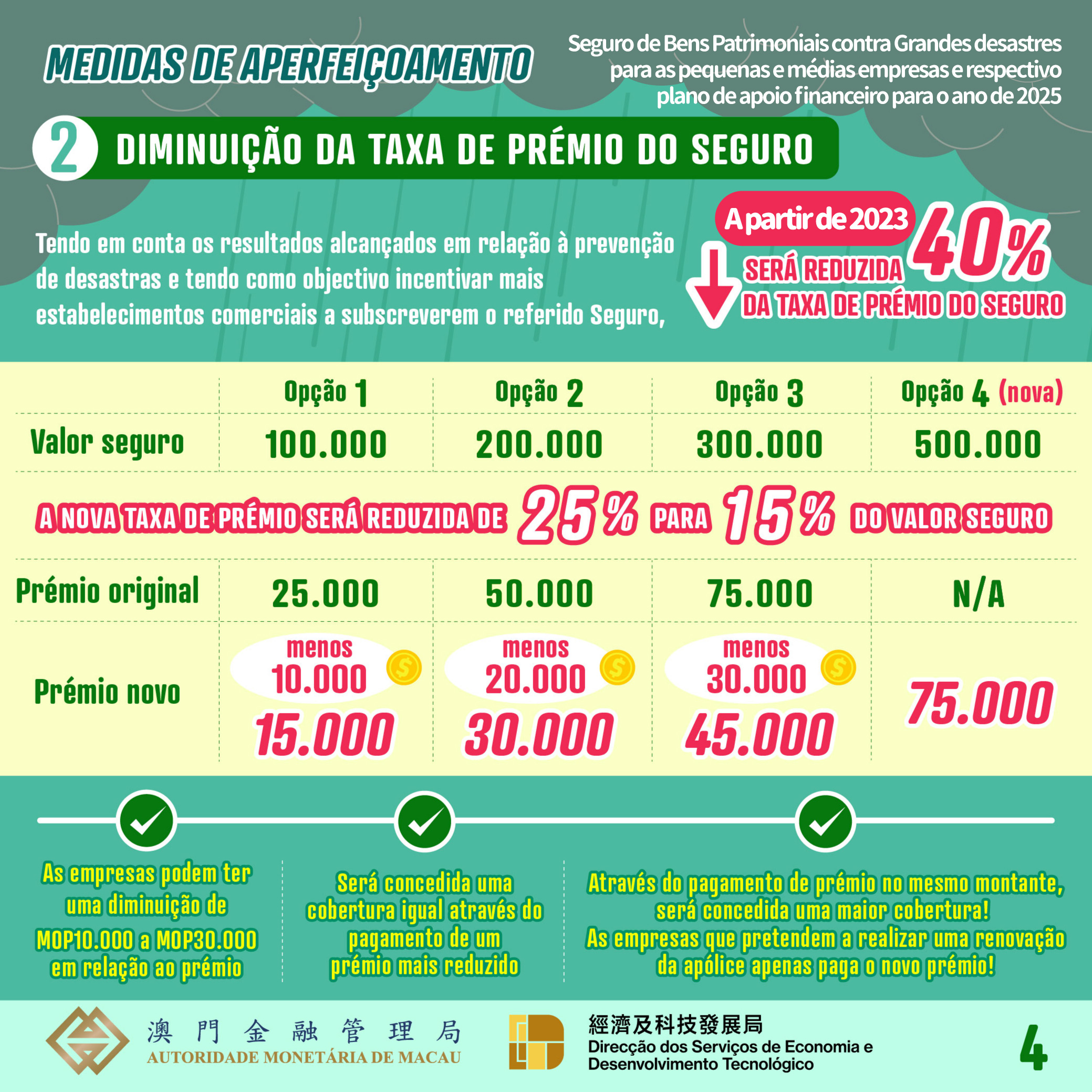 Entretanto, o Governo da RAEM continuará a conceder, através do Fundo de Desenvolvimento Industrial e de Comercialização, o apoio financeiro de prémio do seguro contra grandes desastres às PMEs qualificadas, sendo que o valor do apoio financeiro equivale a 50% ou a MOP30.000 do total anual do prémio padrão (consoante o valor mais baixo), com o intuito de reduzir os encargos financeiros das mesmas.