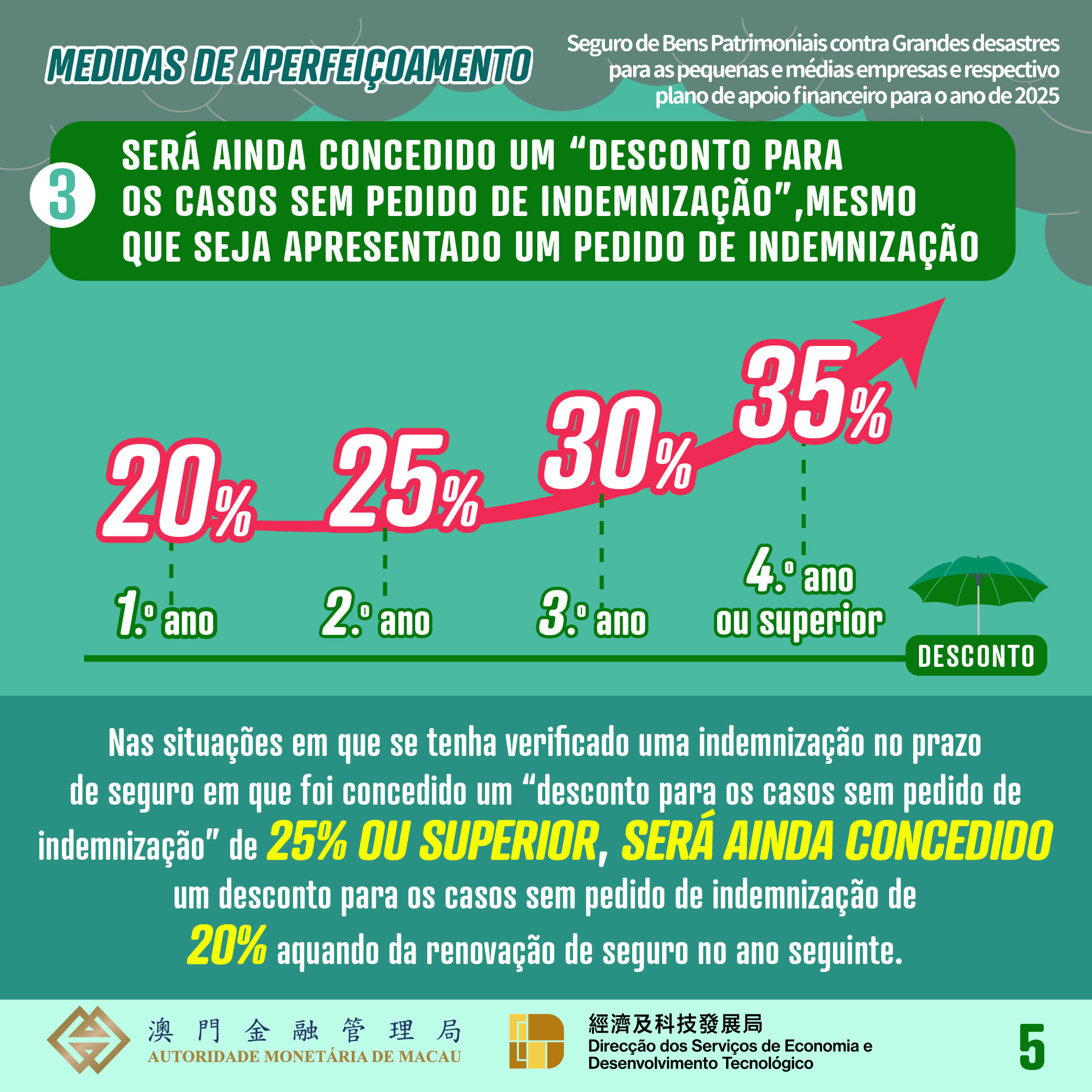 Por outro lado, será dada continuidade à medida de concessão de descontos nos prémios aos comerciantes que nunca apresentaram pedido de indemnização aquando da renovação de seguro, sendo os descontos de 20%, 25%, e 30% para o primeiro ano, segundo ano e terceiro ano de renovação de seguro, respectivamente e, em relação às renovações a afectuar no quarto ano ou nos anos seguintes, serão concedidos descontos de 35%. Além disso, no caso de um comerciante, durante o período em que goza do desconto de 25% ou superior, apresentar um pedido de indemnização, será concedido no ano seguinte um desconto de 20% nos prémios aquando da renovação do respectivo seguro, sendo que o desconto máximo a conceder será limitado a 35% numa base anual, aquando da renovação de seguro, se não for apresentado qualquer novo pedido de indemnização.