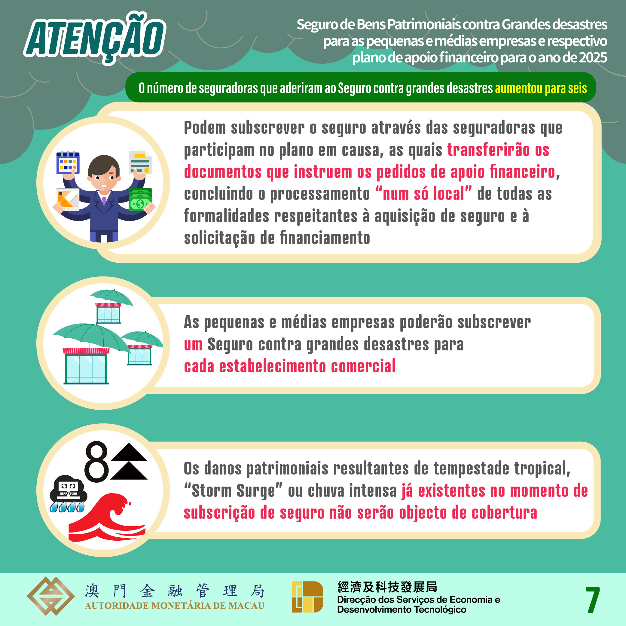 Com vista a facilitar a subscrição de seguros por parte dos comerciantes, o número de seguradoras locais que aderiram ao Seguro contra grandes desastres aumentou este ano para seis. As pequenas e médias empresas (PMEs) podem subscrever um “Seguro contra grandes desastres” para cada estabelecimento comercial. No âmbito deste programa, existem montantes seguros à escolha dos comerciantes, nomeadamente de MOP100.000, MOP200.000, MOP300.000 e MOP500.000.
