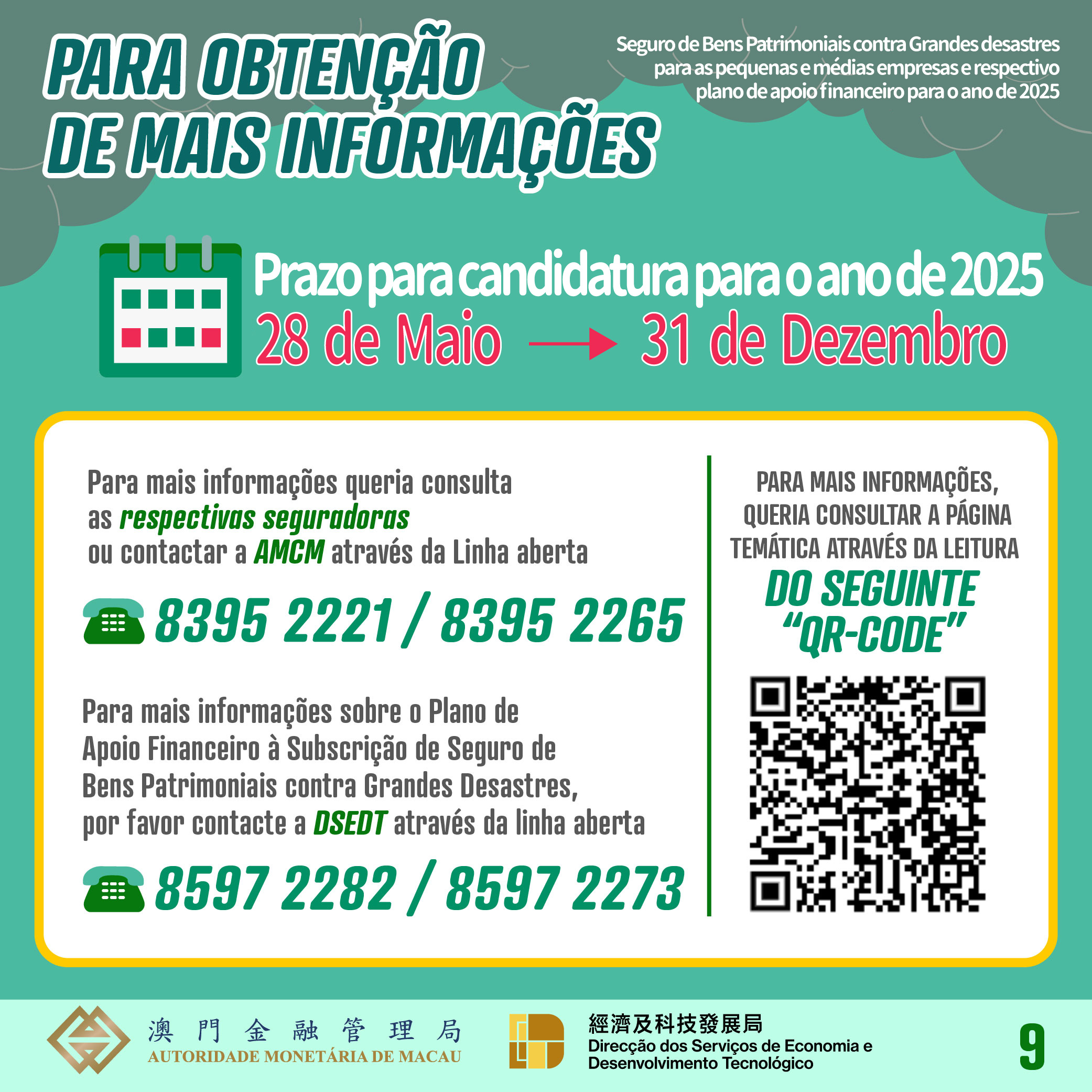 A página oficial da AMCM foi actualizada, constando informações detalhadas relativas ao “Seguro contra grandes desastres” para o ano de 2025, a lista das seguradoras autorizadas para prestar o referido seguro, bem como as informações sobre o Plano de apoio financeiro (https://www.amcm.gov.mo/pt/about-amcm/about-amcm-typhoon-information?type=SME-Catastrophe-Property-Insurance-and-Subsidy-Scheme).