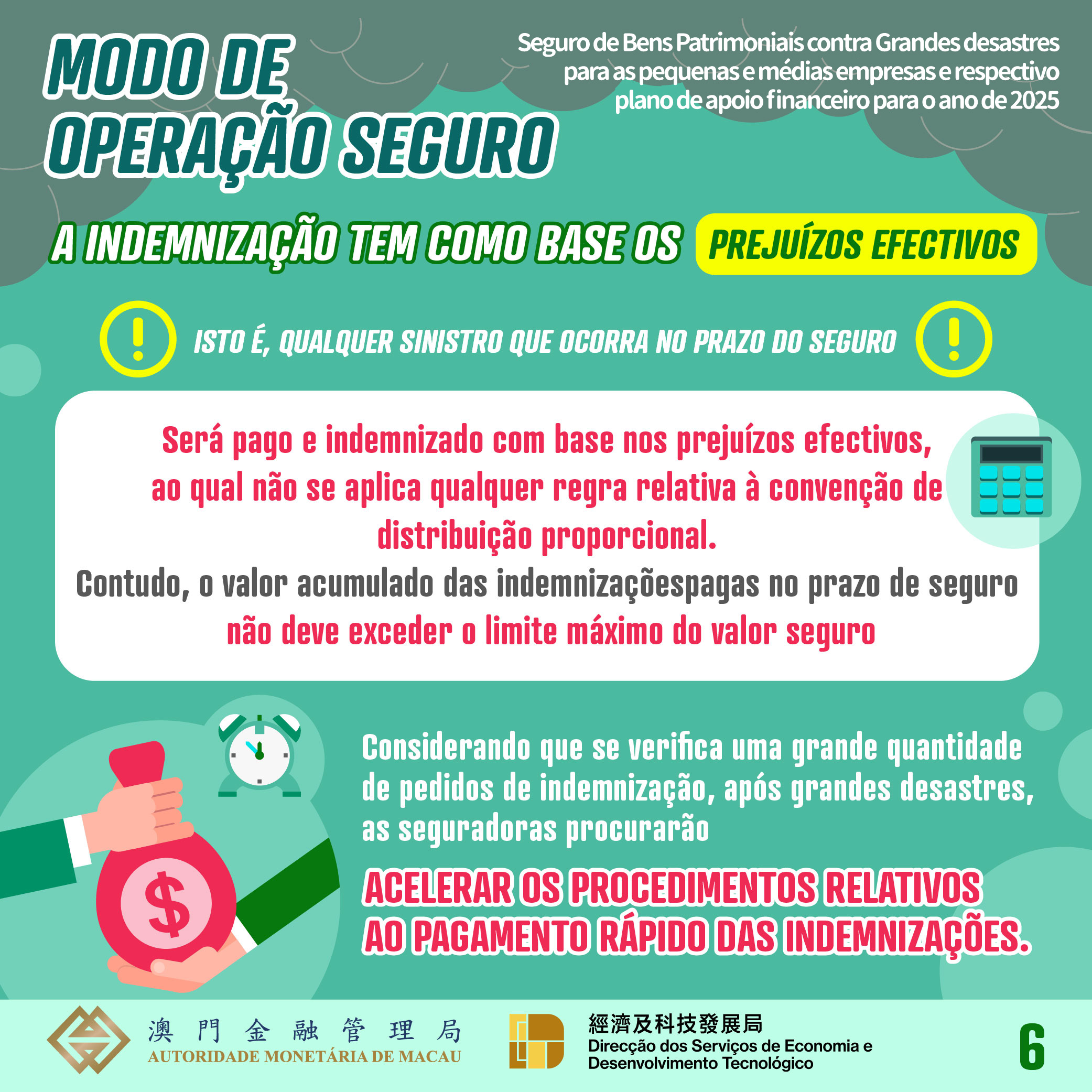 Para facilitar o processamento das formalidades respeitantes à aquisição de “Seguro contra grandes desastres” e à solicitação do apoio financeiro, “num só local”, por parte dos comerciantes interessados, as seguradoras podem ajudar a colectar e transferir os documentos do pedido de apoio financeiro. Paralelamente, face à premência e às dificuldades com que os comerciantes se confrontam, após grandes desastres, as seguradoras acelerarão os procedimentos com vista ao pagamento rápido das indemnizações.