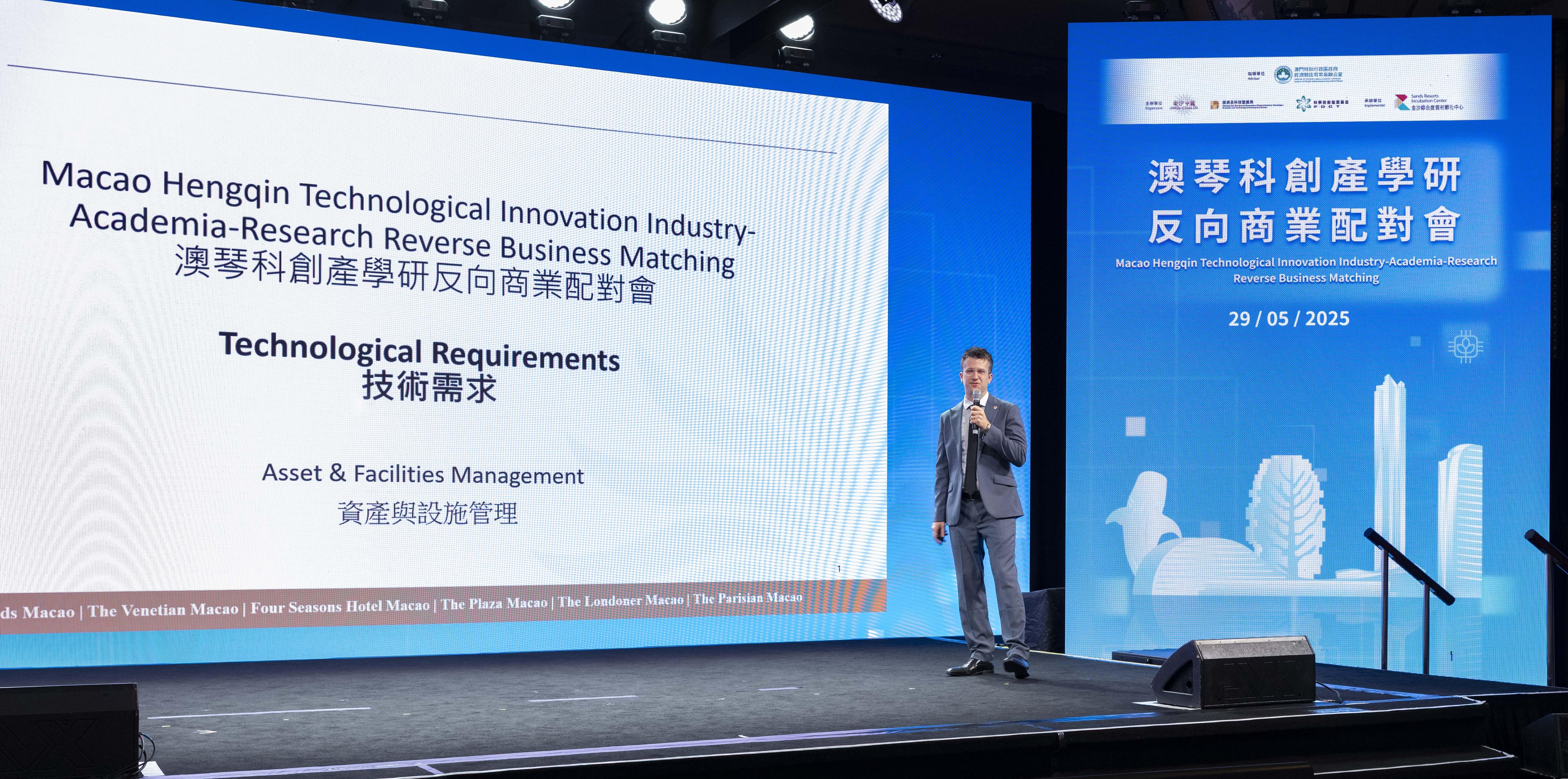 Coorganizado pela Direcção dos Serviços de Economia e Desenvolvimento Tecnológico, o Fundo para o Desenvolvimento das Ciências e da Tecnologia e a Sands China Ltd., o "Encontro Inverso de Correspondência Comercial no âmbito da Indústria, Academia e Investigação Científica da Inovação e Tecnologia entre Macau e Hengqin" teve lugar hoje (29) no Salão Greenwich do The Londoner Macao. O evento contou com a participação de representantes das empresas tecnológicas certificadas de Macau, das empresas tecnológicas de Macau e Hengqin e das instituições de ensino superior, que, através da disponibilização por parte da Sands China de cenários de operação e necessidades tecnológicas, estabeleceram correspondência precisa com as empresas tecnológicas e os investigadores, esperando orientar a transformação dos resultados científicos e tecnológicos com base em necessidades reais, promovendo a cooperação profunda entre a inovação tecnológica e a economia real, e impulsionando o desenvolvimento de soluções inovadoras para o turismo inteligente.