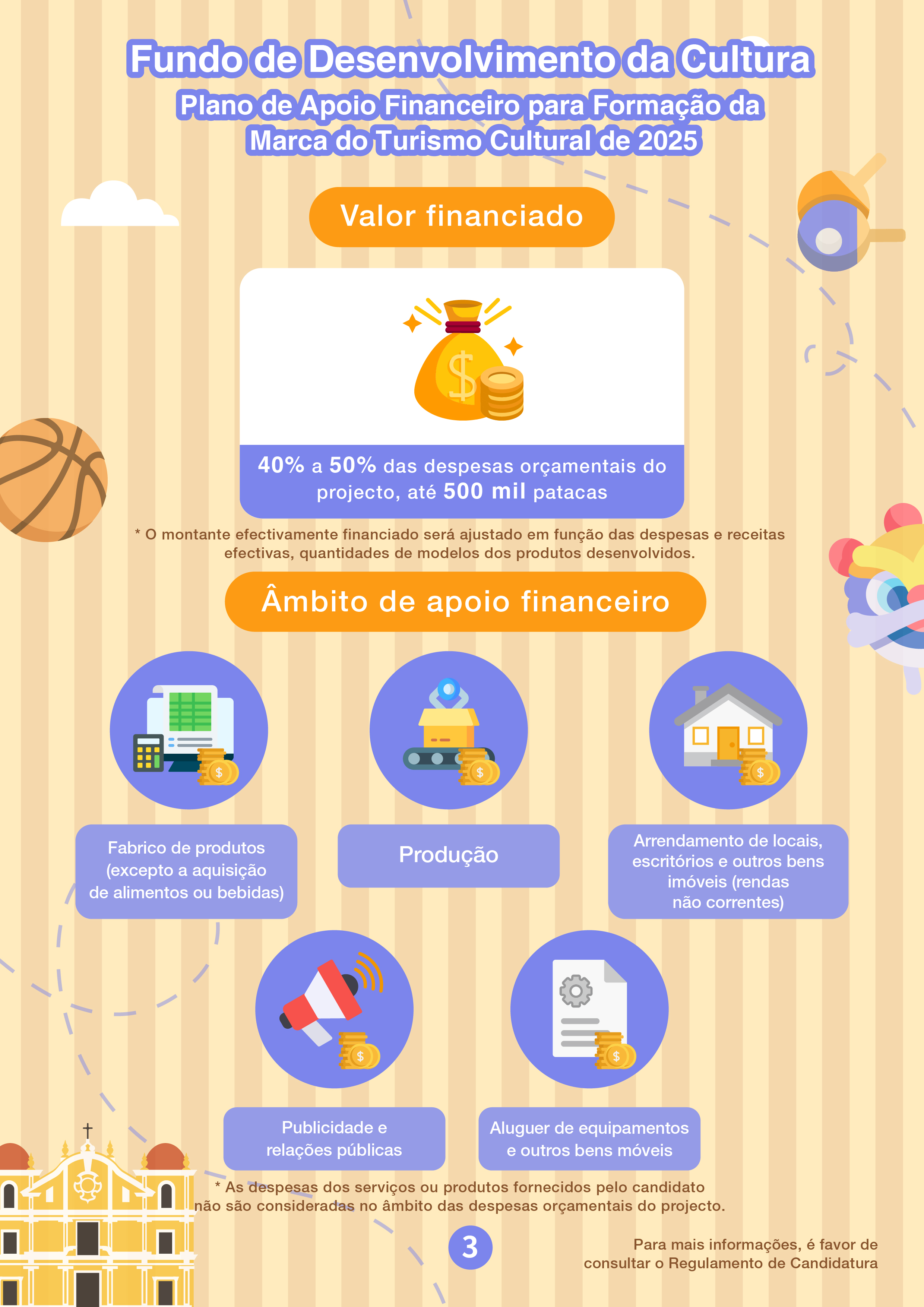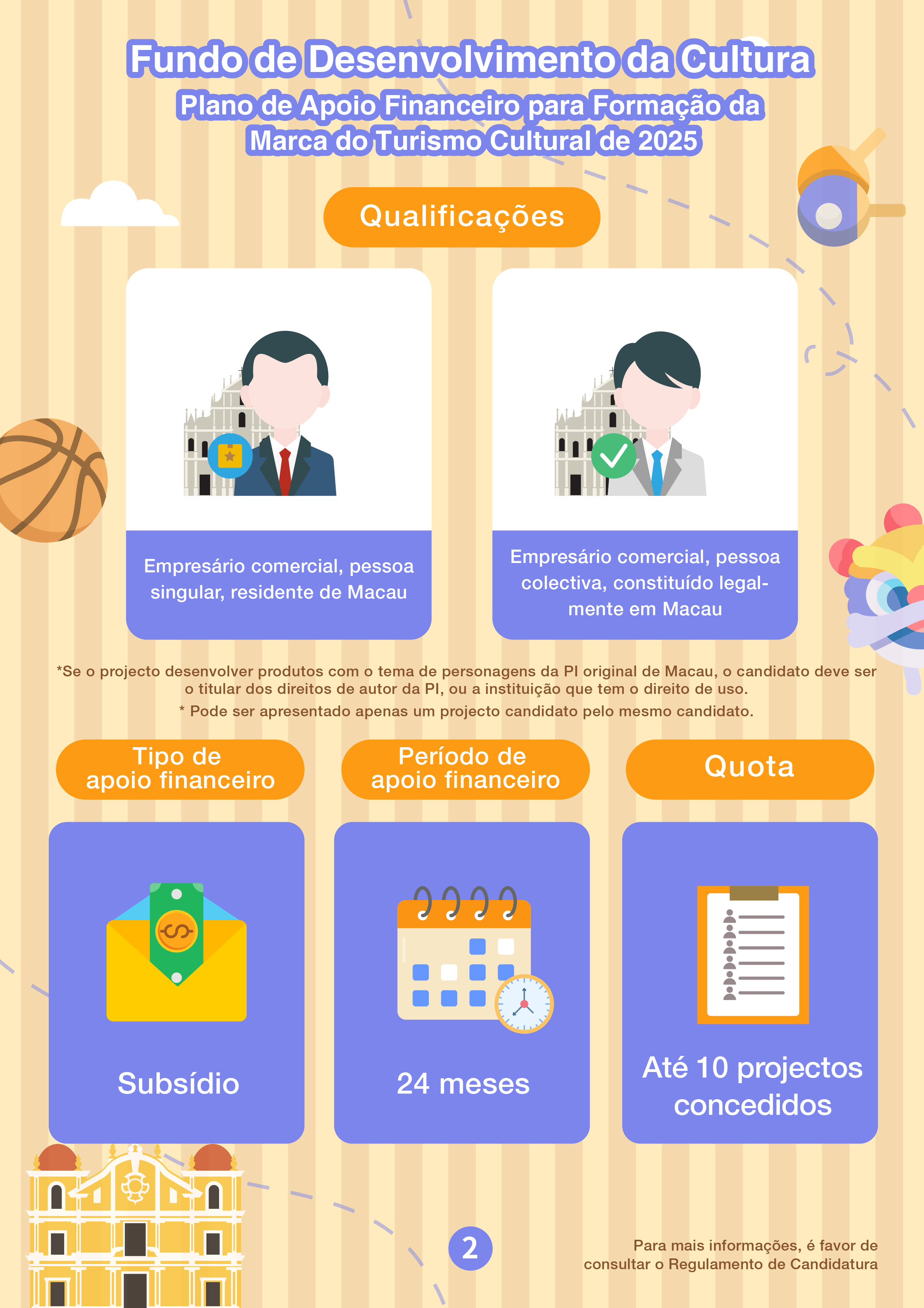 O período de candidatura do “Plano de Apoio Financeiro para Formação da Marca do Turismo Cultural de 2025” decorrerá de 3 de Junho a 4 de Julho, visando promover as empresas culturais e criativas de Macau a desenvolverem produtos do turismo cultural, sob o tema do património cultural ou de personagens da propriedade intelectual original de Macau, e que é ainda incentivada a integração dos elementos desportivos dos Jogos Nacionais, de modo a explorar as sinergias entre o desporto, o turismo e a cultura. A modalidade do apoio financeiro deste Plano é por subsídios, enquanto que o limite máximo a conceder é de 40% a 50% das despesas orçamentais do projecto, até 500 mil patacas, com um máximo de 10 quotas e um período de apoio financeiro de 24 meses.