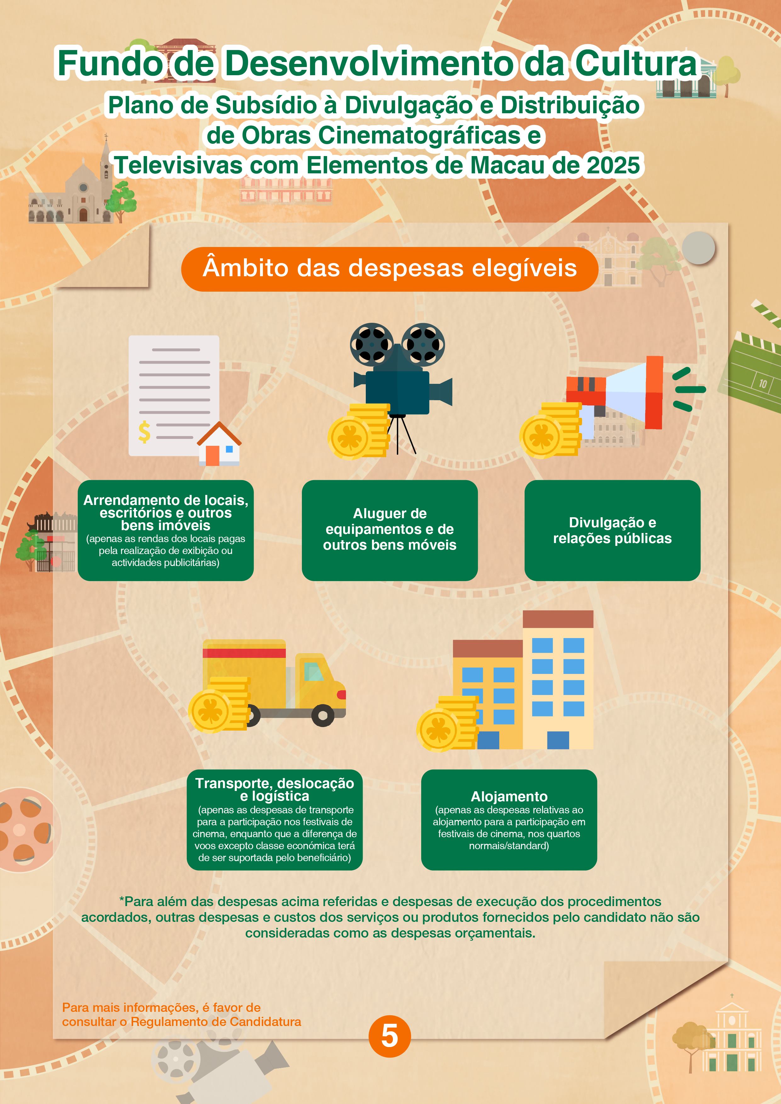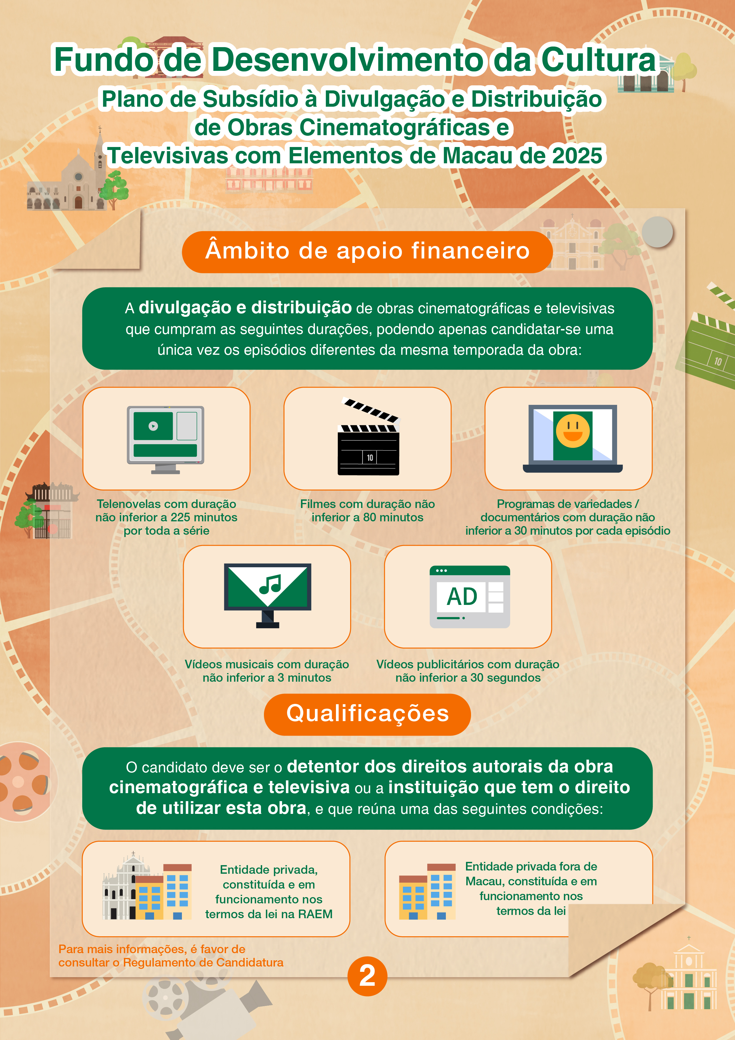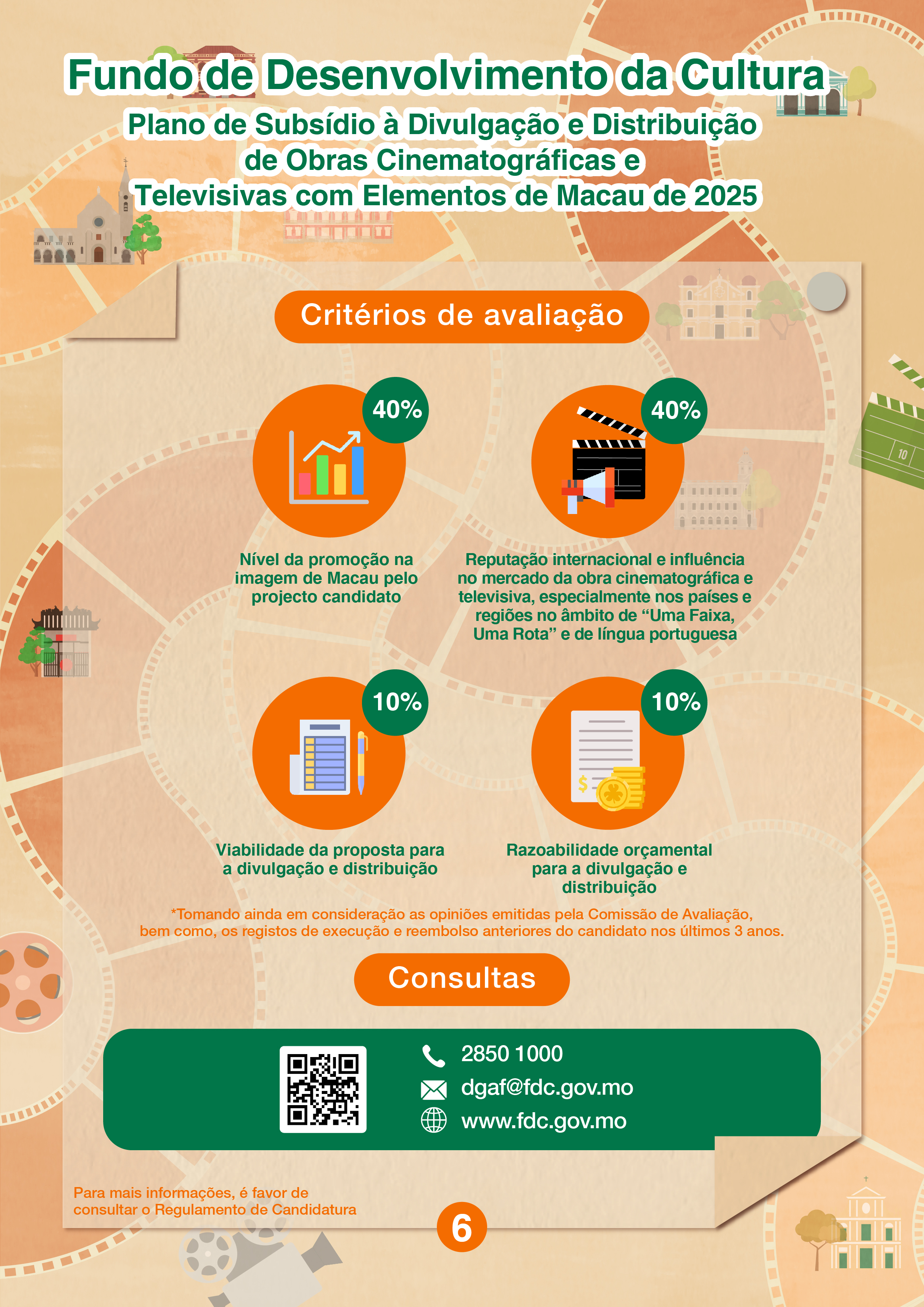 O FDC irá realizar duas sessões de esclarecimento, no dia 17 de Junho, no rés-do-chão do Edifício Público (endereço: Avenida da Amizade, n.º 1101A-1115, Edifício de Escritórios do Governo (ZAPE), rés-do-chão, Macau), das quais, a primeira sessão do “Plano de Subsídio à Divulgação e Distribuição de Obras Cinematográficas e Televisivas com Elementos de Macau de 2025” será realizada às 15h00 e a segunda sessão do “Plano de Apoio Financeiro para Formação da Marca do Turismo Cultural de 2025” será realizada às 16h30. Os interessados podem inscrever-se na página electrónica do FDC (www.fdc.gov.mo). Para quaisquer consultas, é favor de contactar-nos através do telefone, n.º 2850 1000 ou por email, dgaf@fdc.gov.mo.