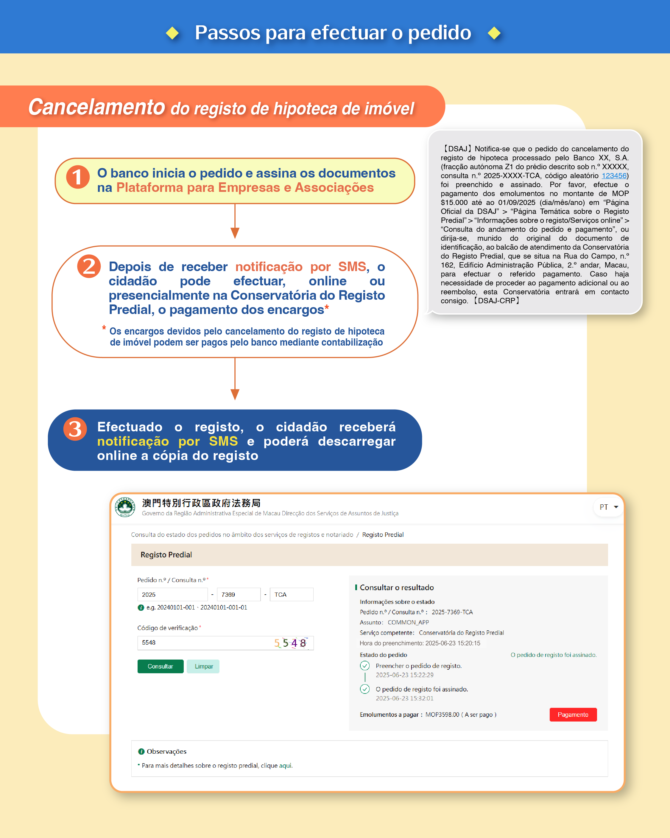 Quanto aos registos predial e de bens móveis, é lançado o serviço totalmente electrónico de cancelamento do registo de hipoteca de imóveis e de automóveis, o que muda completamente a prática de aquisição dos serviços ao longo destes anos. Actualmente, para o cancelamento de registo de hipoteca de imóveis e de automóveis, o requerente tem de dirigir-se presencialmente a cartórios notariais e à Conservatória do Registo Predial para apresentar o pedido. Na sequência de tratamento das respectivas formalidades notariais pelo representante do banco, o requerente desloca-se pessoalmente à conservatória para pagar os encargos e levantar a cópia do registo. Assim sendo, em relação ao serviço totalmente electrónico lançado desta vez, os cidadãos não necessitam de se deslocar aos serviços para apresentar nenhum pedido ou documento, e os bancos (credores hipotecários) podem proceder, de modo directo e online, através da Plataforma para Empresas e Associações, à prestação da declaração de renúncia à hipoteca, à apresentação do pedido de registo e à obtenção da cópia do registo, reduzindo então o tempo precioso e esforços dos cidadãos e os procedimentos administrativos do banco, de modo a facultar uma conveniência ao máximo.