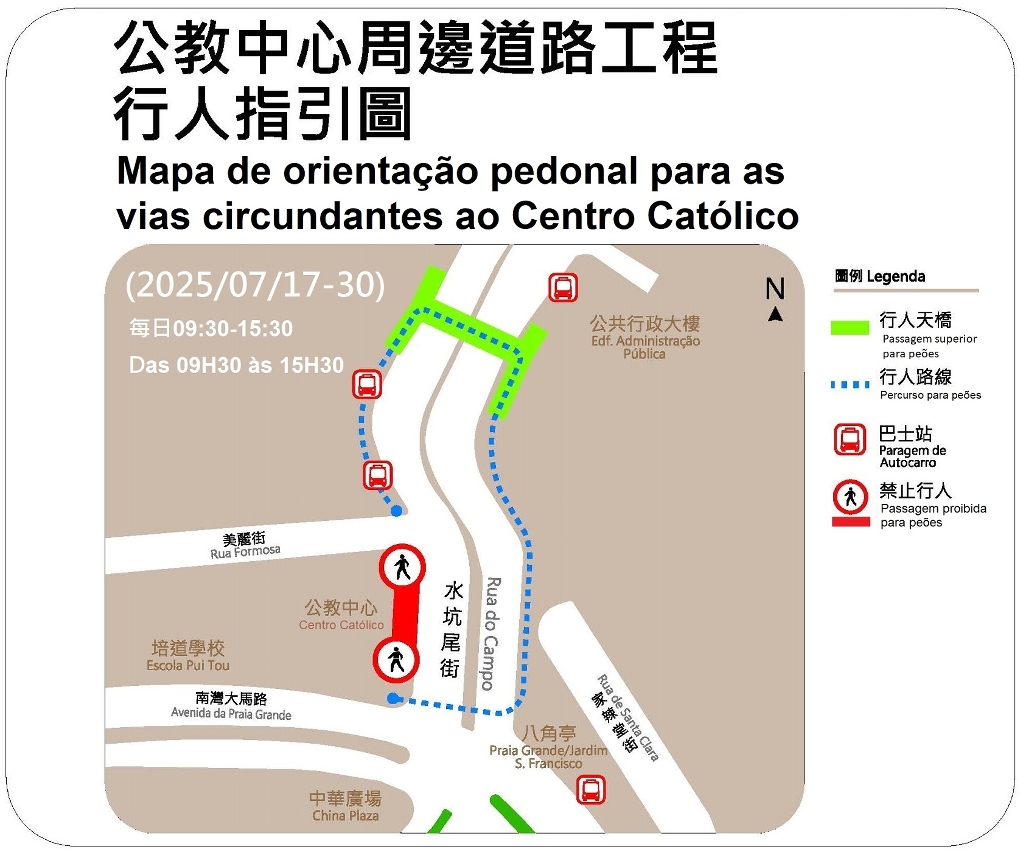 As obras serão realizadas em duas fases, sendo a primeira de 5 a 30 de Julho, durante a qual, de 6 de Julho, pelas 10h00, a 30 de Julho, a Rua Formosa estará encerrada ao trânsito. De 17 a 30 de Julho, diariamente das 9h30 às 15h30, o passeio em frente ao Centro Católico na Rua do Campo estará interdito a peões. Os peões que se desloquem entre o Pavilhão Octogonal ou a Avenida da Praia Grande e a zona da Rua Formosa e Travessa do Anjo deverão utilizar a passagem superior para peões (todas as medidas estão indicadas na tabela anexa). A segunda fase das obras terá início logo a seguir, de 31 de Julho a 30 de Agosto, altura em que o troço da Avenida da Praia Grande junto ao Centro Católico terá trânsito condicionado, sendo que os detalhes dos arranjos temporários do trânsito serão anunciados na segunda quinzena de Julho.
